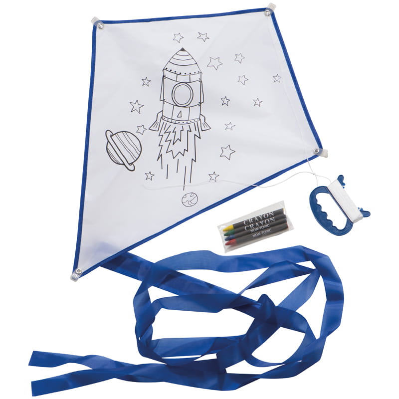 Latawiec do kolorowania dla dzieci w zestawie z 4 kredkami świecowymi, wstążką i żyłką. Logotyp można umieścić na etykiecie i przykleić na pokrowcu.
