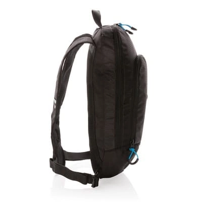 Mały plecak turystyczny, pojemność 7l, wykonany z wytrzymałej tkaniny poliestrowej, doskonale nadaje się do aktywności na świeżym powietrzu, wewnątrz kieszeń na butelkę, plecak posiada otwór do wyprowadzenia rurki nawadniającej, przednia kieszeń na zamek błyskawiczny, zintegrowana osłona przeciwdeszczowa, miękkie, regulowane paski na ramię, nie zawiera PVC