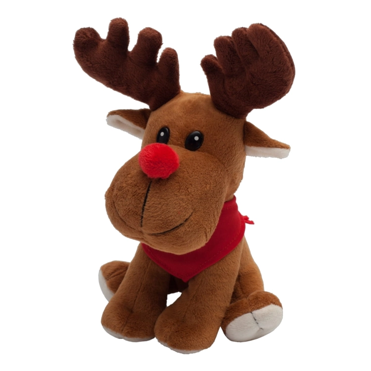Maskotka Renifer oferowana z zawiązywaną czerwoną chustą.