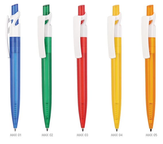 Biały pełny klip, kolorowy transparentny przycisk i korpus.