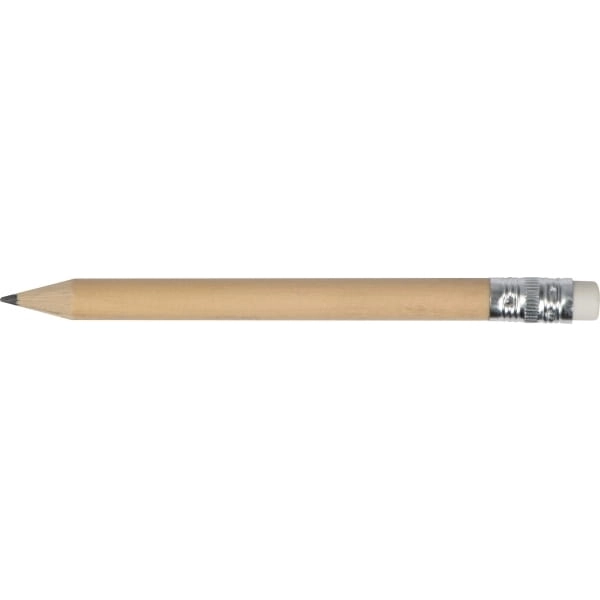 Mały ołówek z białą gumką do zmazywania, zatemperowany.