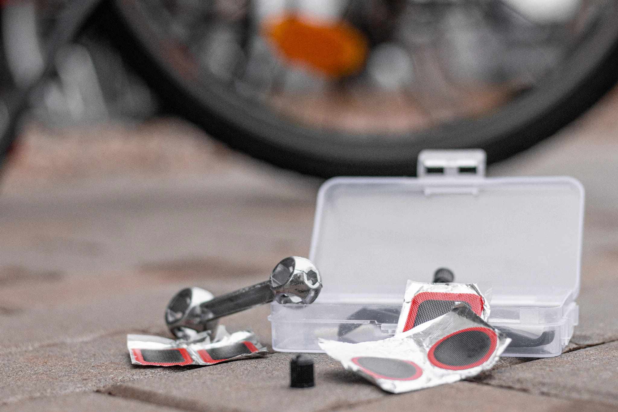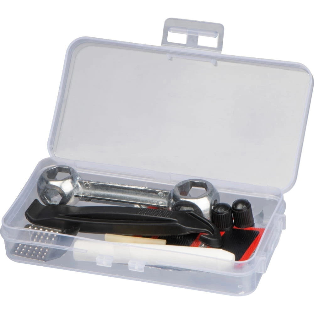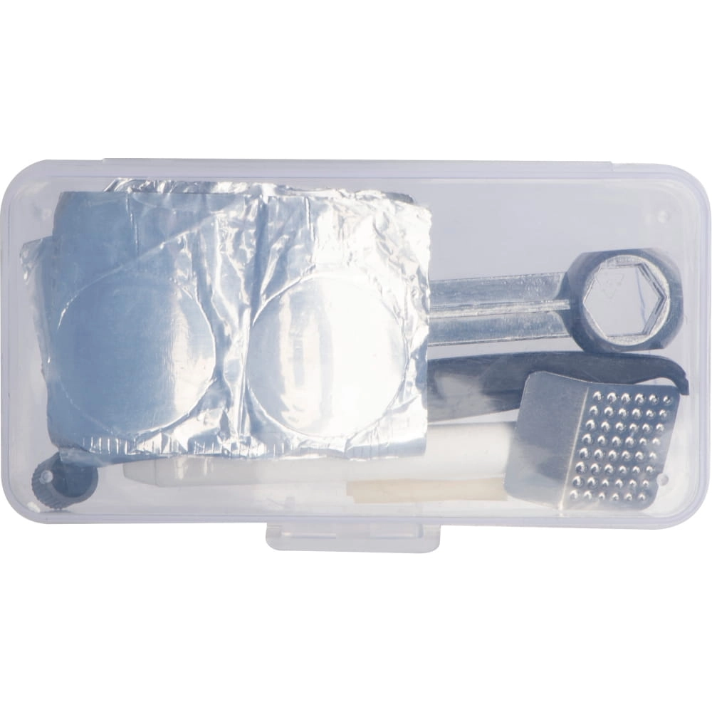 Zestaw narzędzi do naprawy roweru. W zestawie znajduje się listek papieru ściernego, klucz, 5 łatek, 2 wentyle, 2 nakrętki na wentyle oraz 2 łyżki do opon.