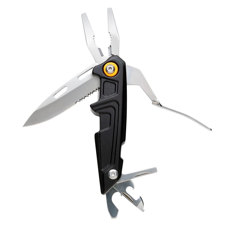Bardzo wytrzymałe narzędzie wielofunkcyjne z zestawem 9 bitów, wykonane ze stali nierdzewnej, aluminiowy uchwyt, 10 funkcji: długie szczypce, kombinerki, przecinak do drutu i kabli, nóż, ostrze ząbkowane, otwieracz do puszek, otwieracz do butelek, śrubokręt płaski, adapter wkrętaka i zestaw końcówek wkrętakowych 9 w 1, etui z wysokiej jakości poliestru 1680D w komplecie, w ozdobnym pudełku