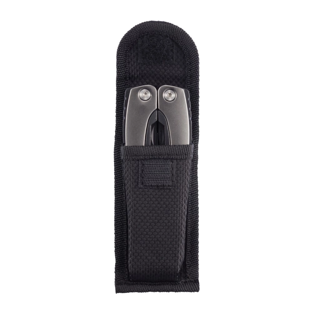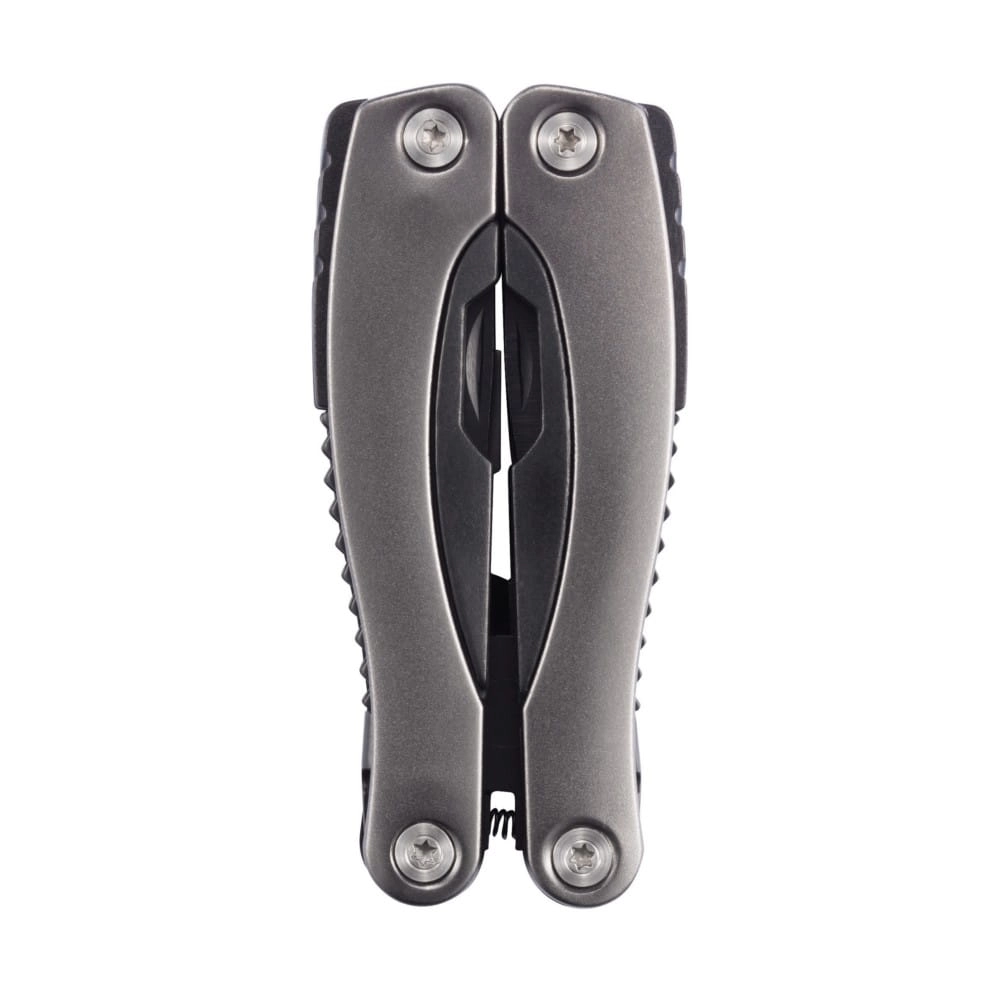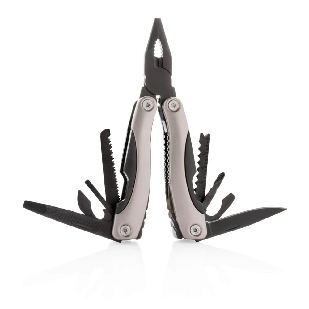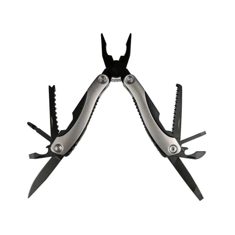 Narzędzie wielofunkcyjne, wykonane ze stali nierdzewnej o czarnym odcieniu, uchwyt z anodyzowanego aluminium, 14 funkcji, czarny pokrowiec w komplecie