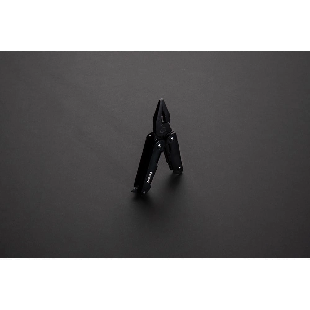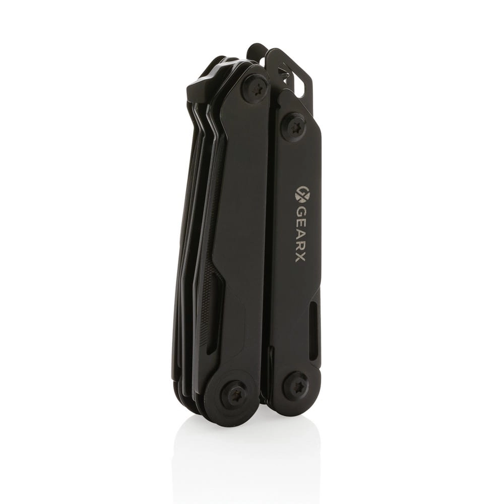 Narzędzie wielofunkcyjne, aluminiowa obudowa, narzędzia wykonane z wytrzymałej stali nierdzewnej 420, funkcje: nóż z blokadą, pilnik, piła, duży śrubokręt płaski z blokadą, śrubokręt krzyżakowy, śrubokręt płaski, szczypce, kombinerki, przecinak do kabli i drutu, otwieracz do butelek, śrubokręt, przecinak do pasów, otwieracz do kartonów, w pudełku podarunkowym