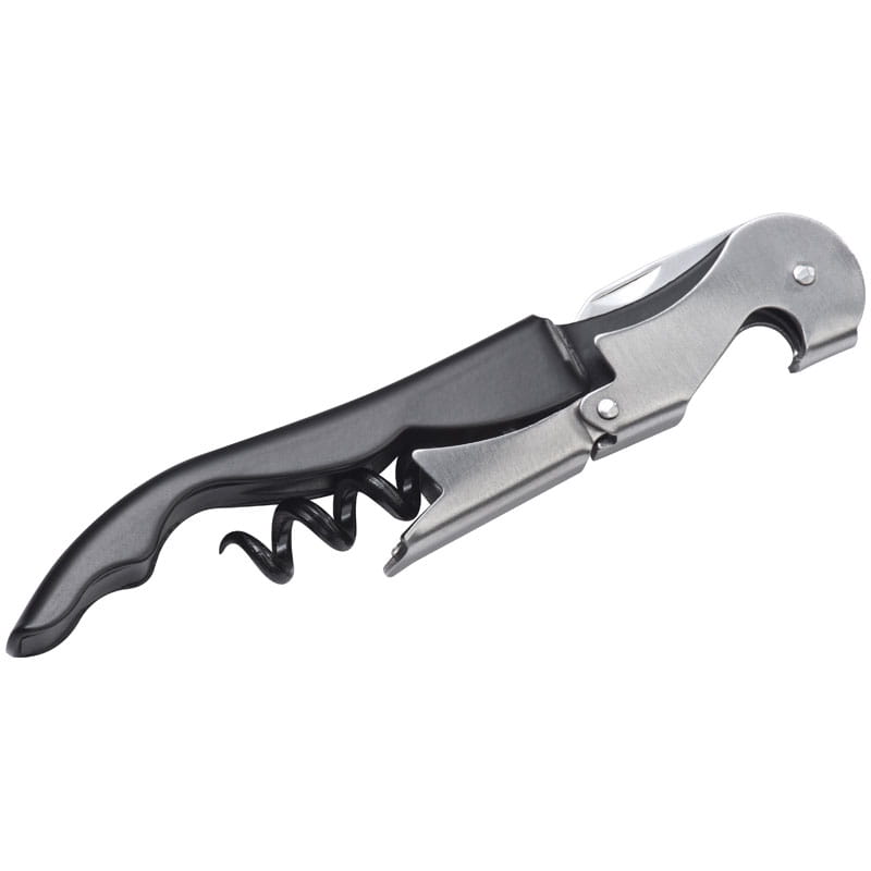 Metalowy nóż kelnerski z otwieraczem do butelek, nożykiem do folii i korkociągiem.