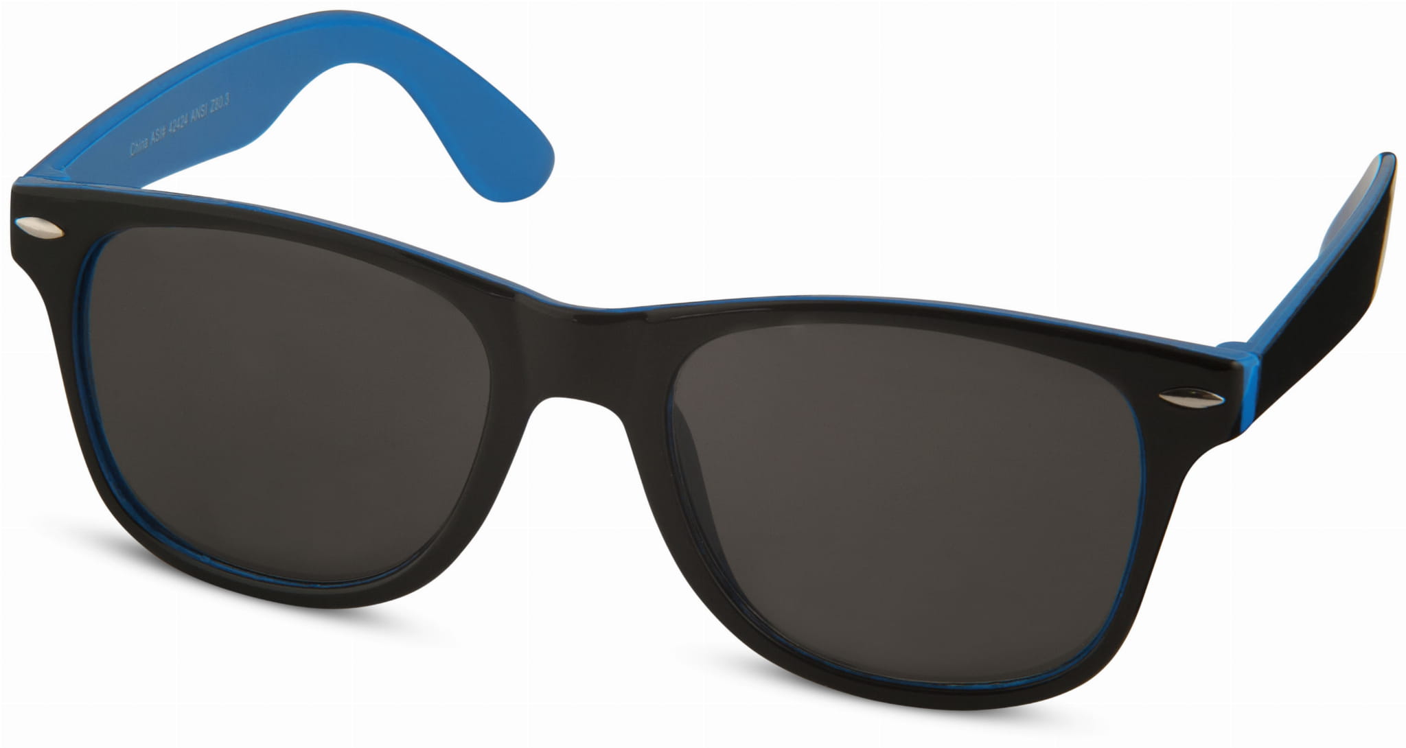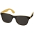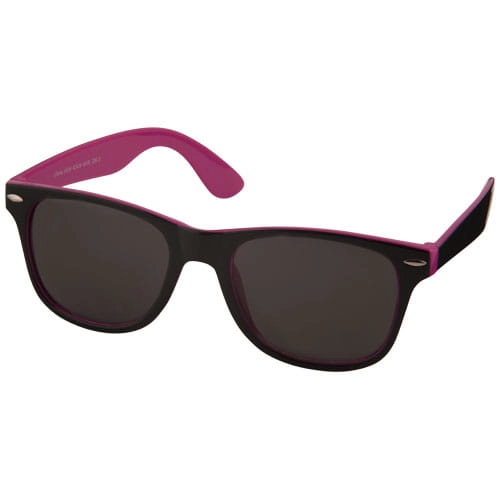 Okulary przeciwsłoneczne Sun Ray z dwoma kolorowymi wstawkami. Retro stylistyka, dwa stopnie przyciemnienia, kolorowe wykończenie po wewnętrznej stronie i czarne soczewki kategorii 3. Zgodne z normami EN ISO 12312-1 i UV400. Plastik PC.