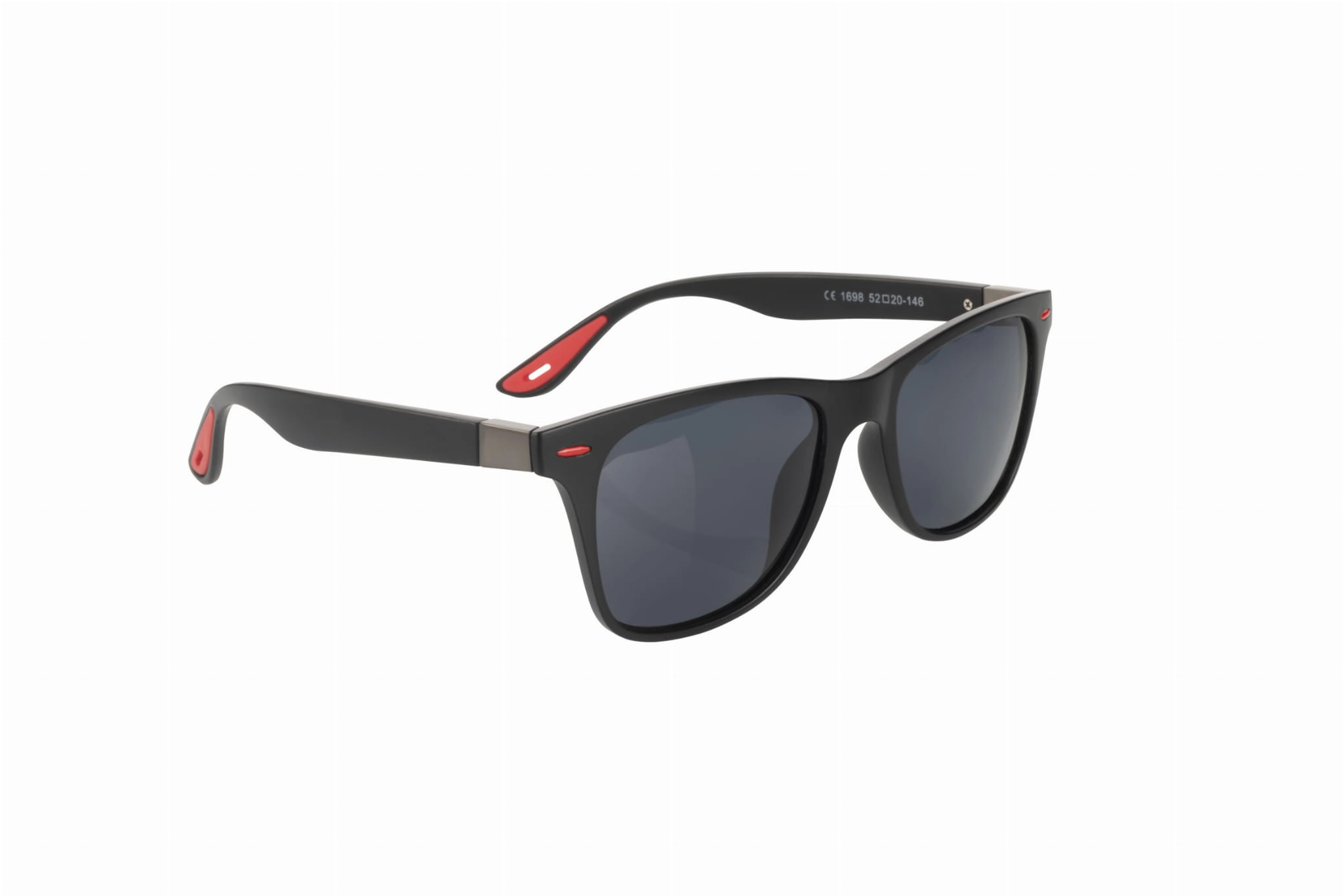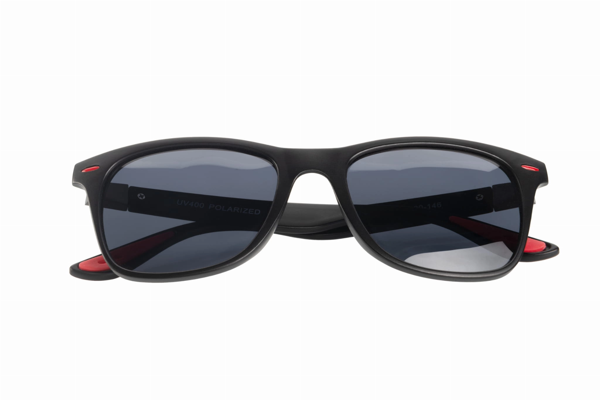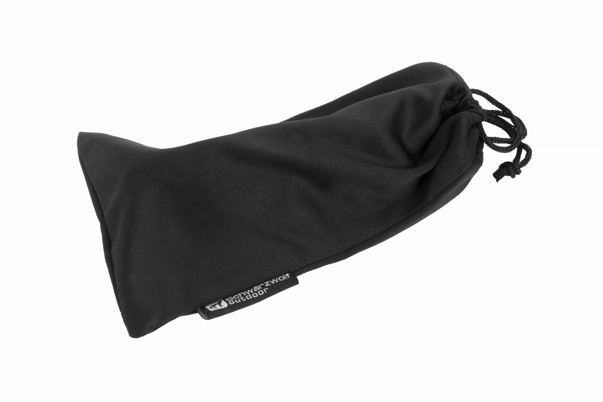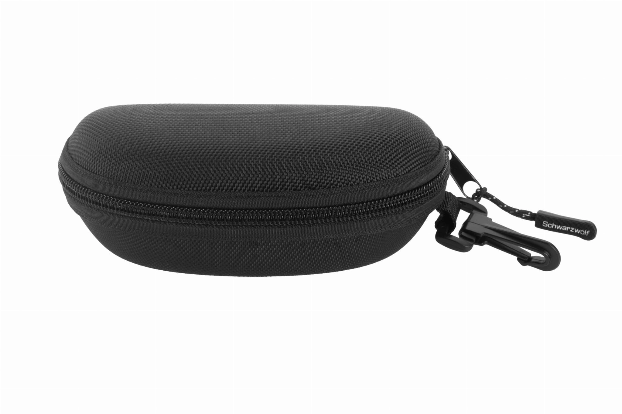 Polaryzacyjne okulary przeciwsłoneczne firmy Schwazwolf. Oprawa okularów w kolorze czarnym z czerwonymi detalami i metalowymi zawiasami, na których umieszczono logo Schwarzwolf. Posiadają czarne soczewki z ochroną UV400. W zestawie czarny woreczek z mikrofibry i twarde czarne etui z zamkiem błyskawicznym. W zestawie biała ściereczka czyszcząca z mikrofibry.