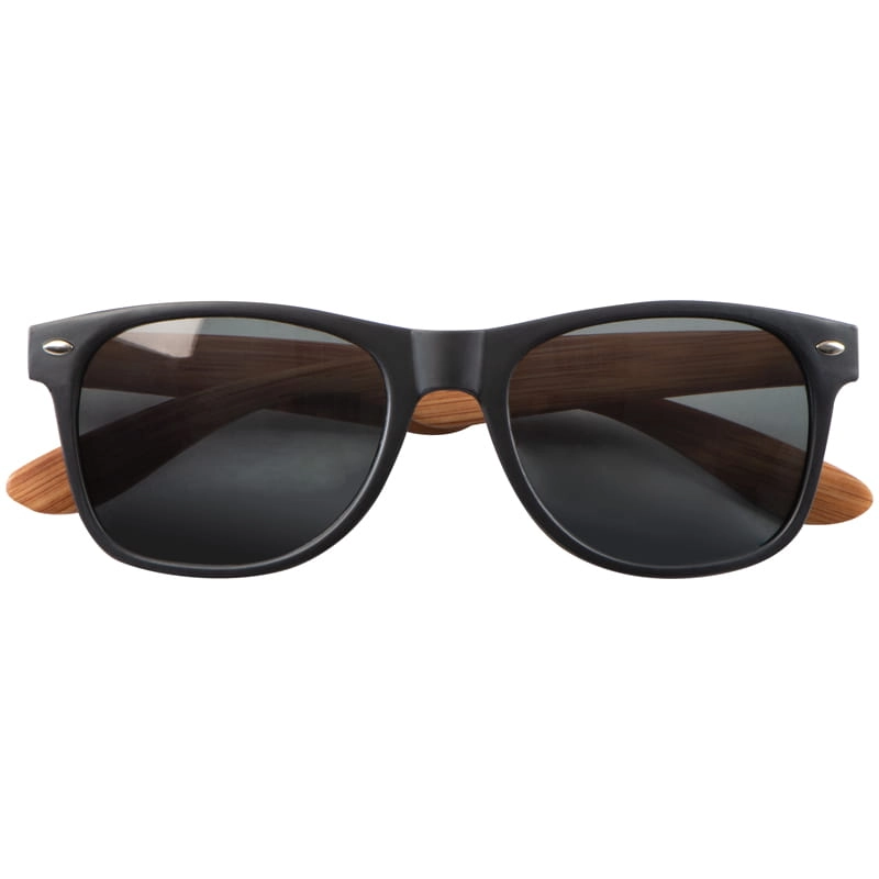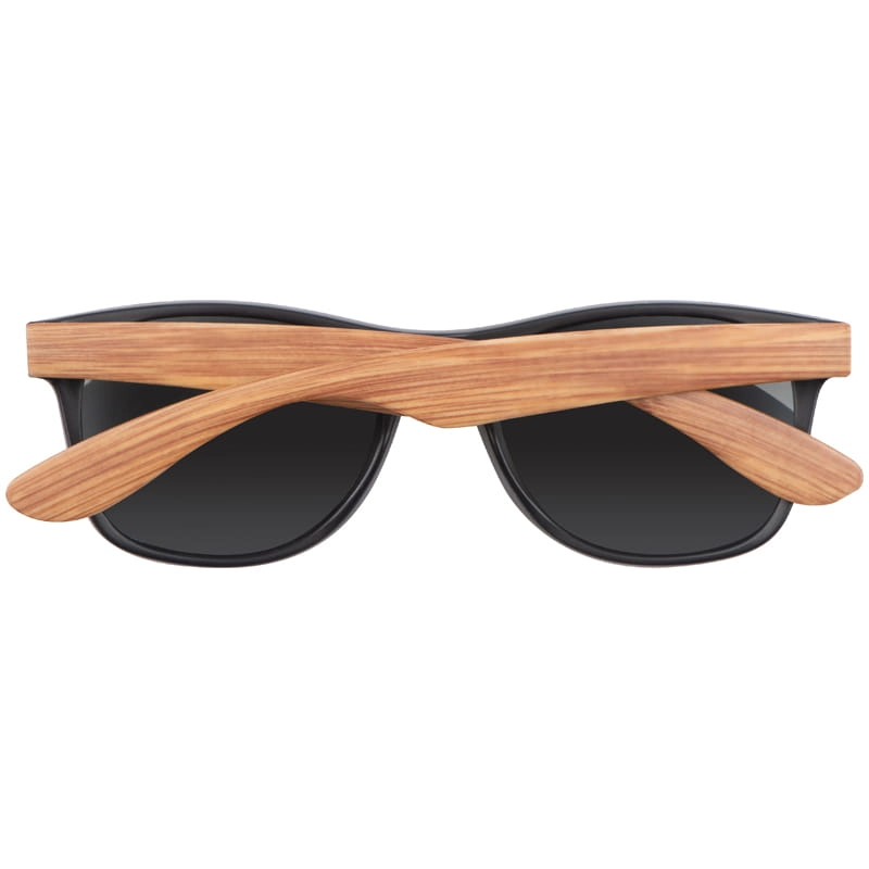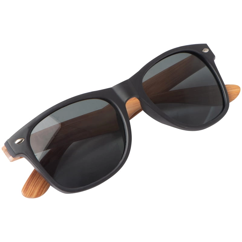 Okulary słoneczne w czarnej oprawie, z mocnego plastiku o strukturze imitującej słoje drewna. Posiadają filtr 400 UV o kategorii 3.