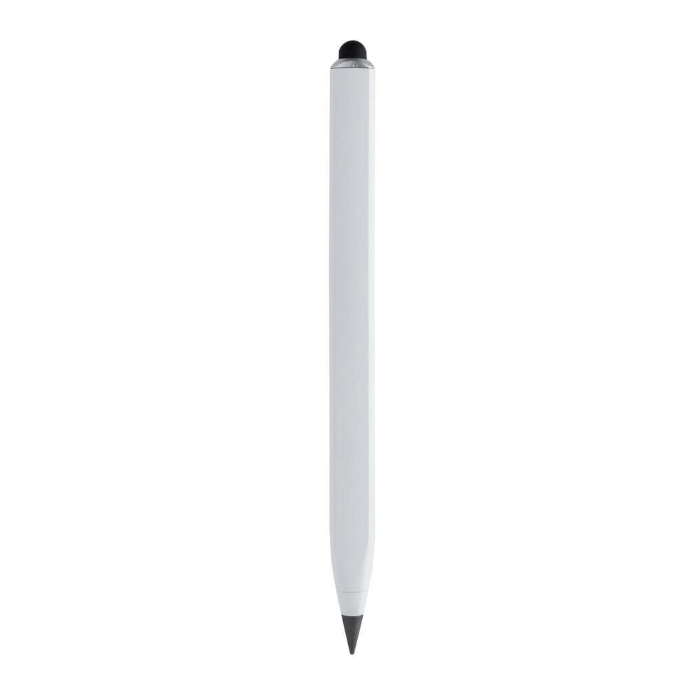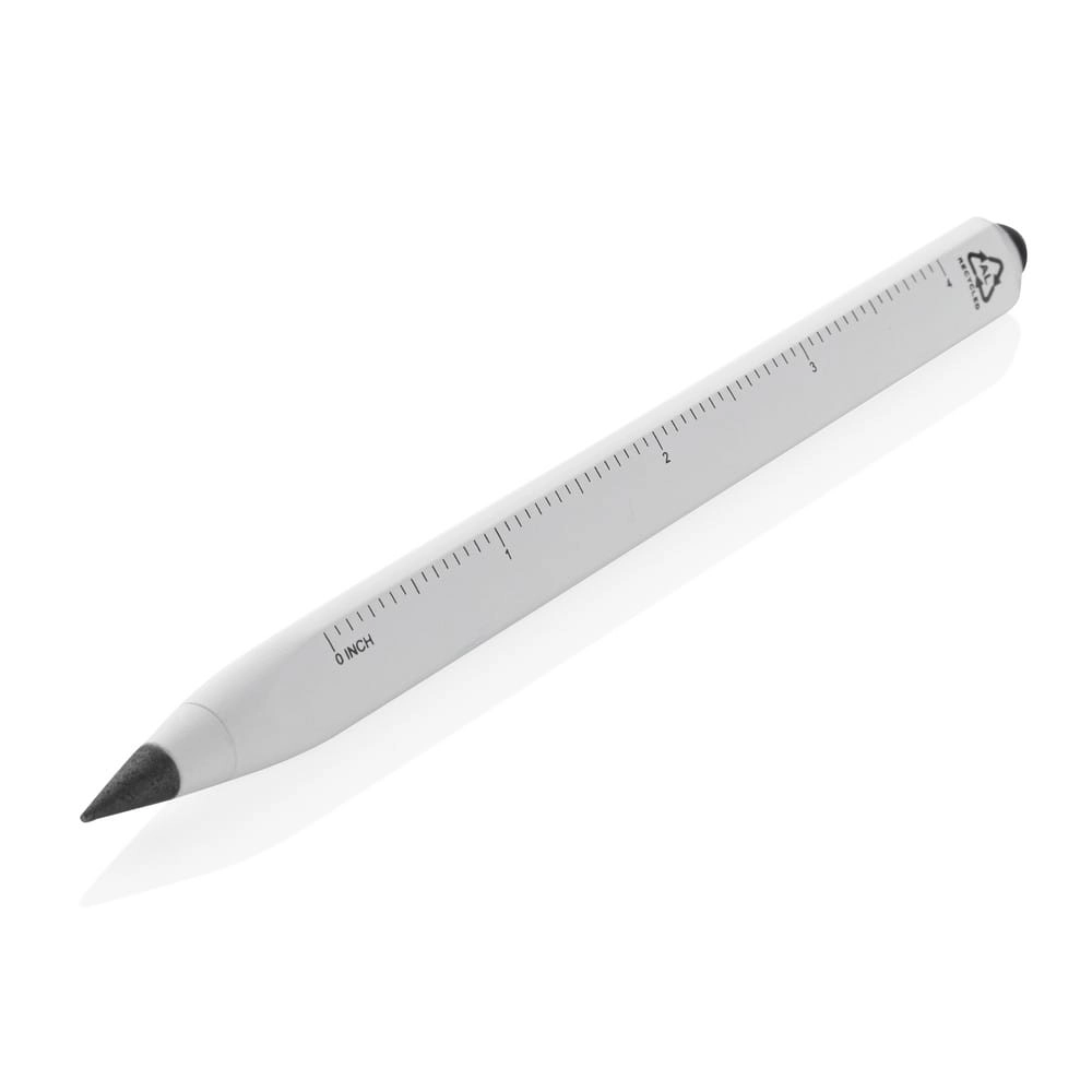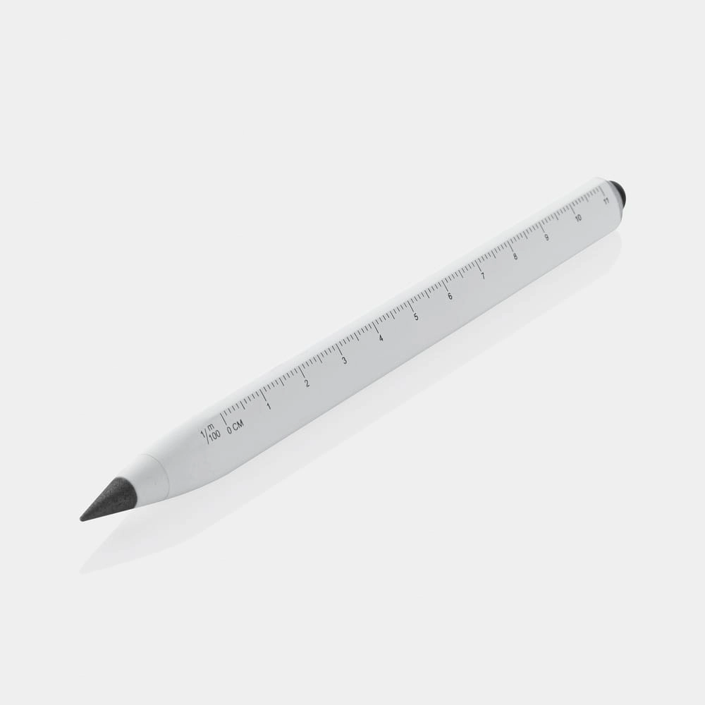 Ołówek, linijka, touch pen, wykonany aluminium z recyklingu, dzięki wykorzystaniu specjalnej wolnościerającej się grafitowej końcówki długość pisania ołówka to około 20 000 metrów w porównaniu z tradycyjnym ołówkiem którego długość pisania to około 200 metrów, notatki można zmazać standardową gumką do mazania
