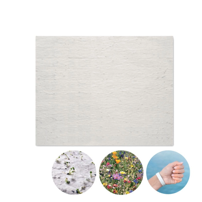 Jeden arkusz to 10 opasek eventowych. Papier makulaturowy z nasionami dzikich kwiatów. 19mm szerokości. Wyprodukowano w UE.