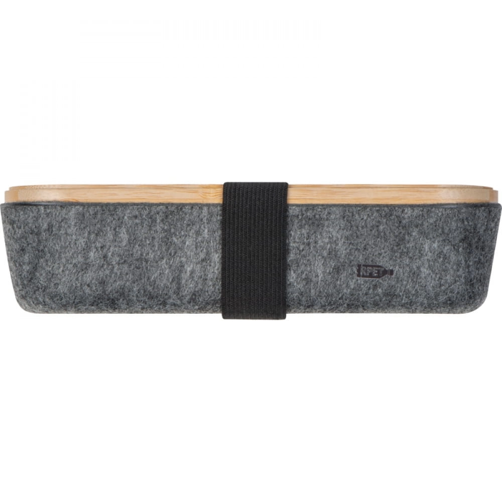 Etui na długopisy wykonane z filcu pochodzącego z recyklingu z bambusową pokrywką, mogącą służyć za podstawkę pod telefon. Pokrywka ma nadrukowaną miarkę. Etui po nałożeniu pokrywki i spięciu gumką może służyć za piórnik.