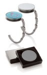 Metalowy wieszak na torebki z metalicznym wykończeniem. Magnetyczne zamykanie.