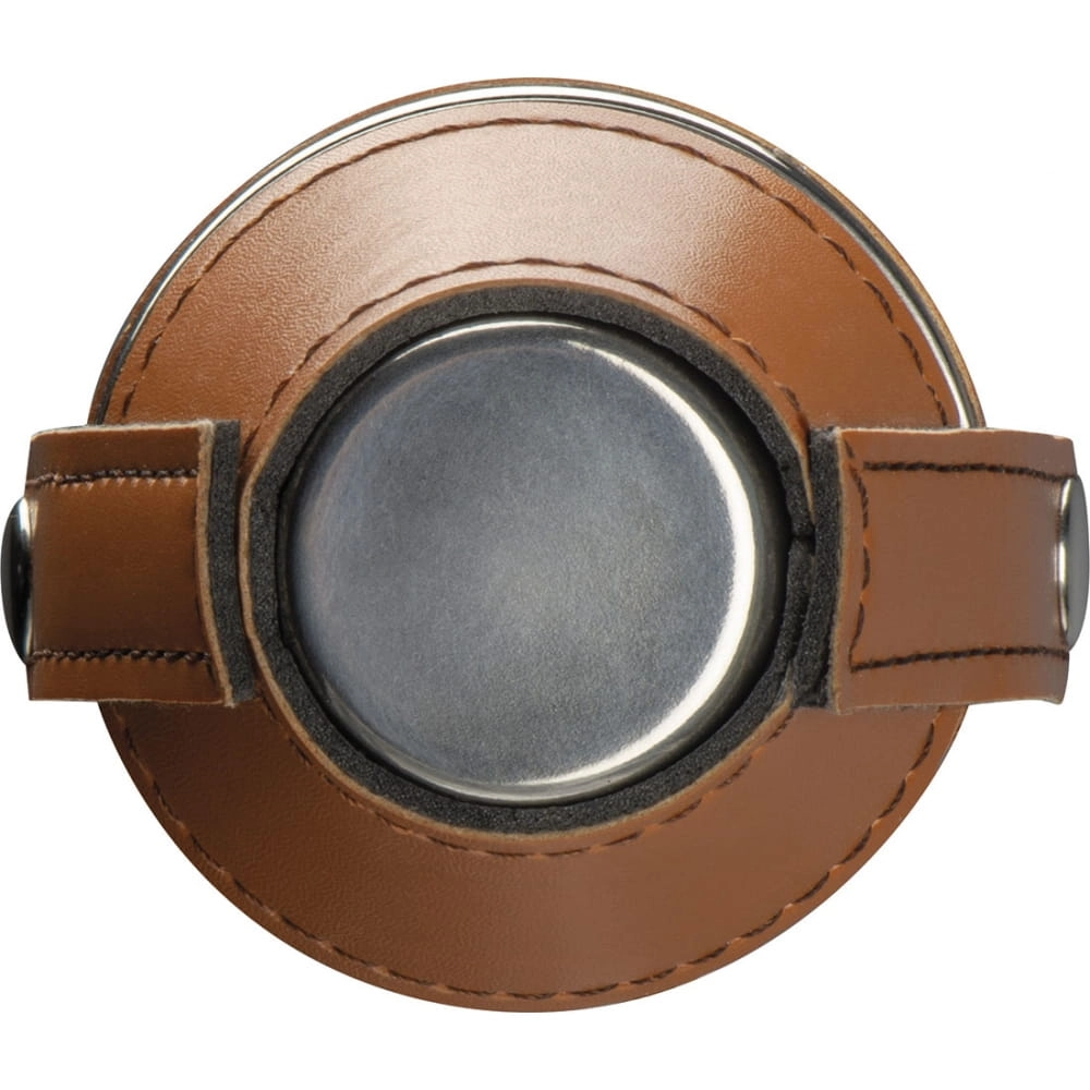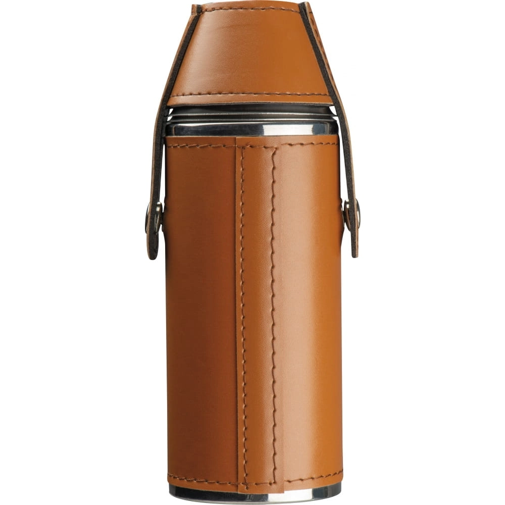 Okrągła piersiówka wykonana ze stali nierdzewnej obita skórpodobnym materiałem PU, z dwoma kieliszkami. Piersiówka ma pojemność 230 ml, kieliszki każdy po 40 ml.