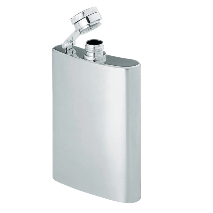 Mała piersiówka ze stali nierdzewnej z bezpiecznym zamknięciem, pojemność 104 ml. Logotyp można umieścić bezpośrednio na produkcie.