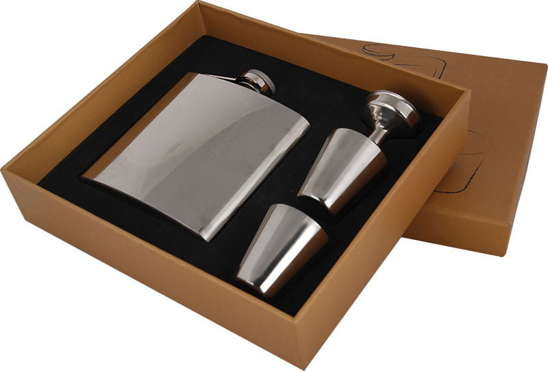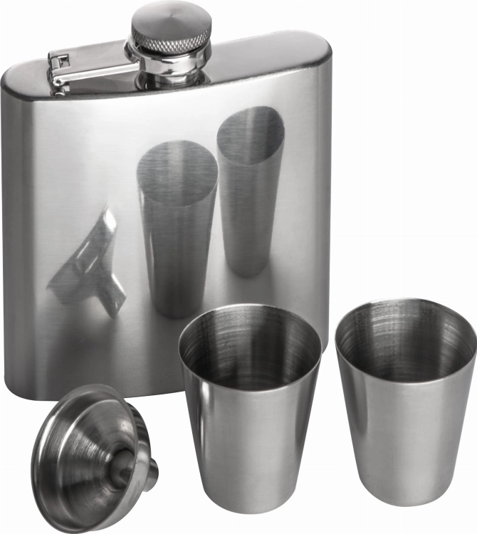 Klasyczna piersiówka wykonana ze stali nierdzewnej w zestawie z dwoma kieliszkami. Pojemność piersiówki: 170 ml. Całość zapakowana w kartonowe opakowanie.