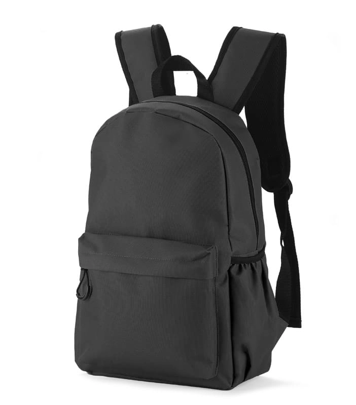 Plecak GINNI wykonany jest z poliestru 600D. Posiada jedną komorę główną zapinaną dwoma suwakami. Z przodu znajduje się spora kieszeń zapinana na zamek, która pomieści potrzebne drobiazgi. Po obu stronach znajdują się otwarte przegrody z gumką mieszczące bidon z wodą. Dno i plecy nie są usztywniane.