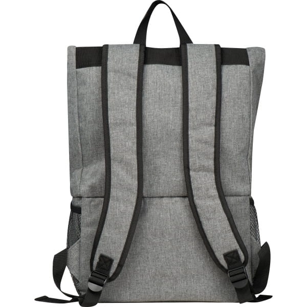 Stylowy plecak wykonany z wytrzymałego poliestru 600D z oddzielną komorą chłodzącą. Dzięki regulowanemu zatrzaskowi u góry rozmiar plecaka można indywidualnie dopasować do wypełnienia. Posiada również przednią przegrodę zapinaną na zamek, dwie przegrody z siatki na zewnątrz (jedna po prawej i jedna po lewej stronie) oraz regulowane, wyściełane szelki.
