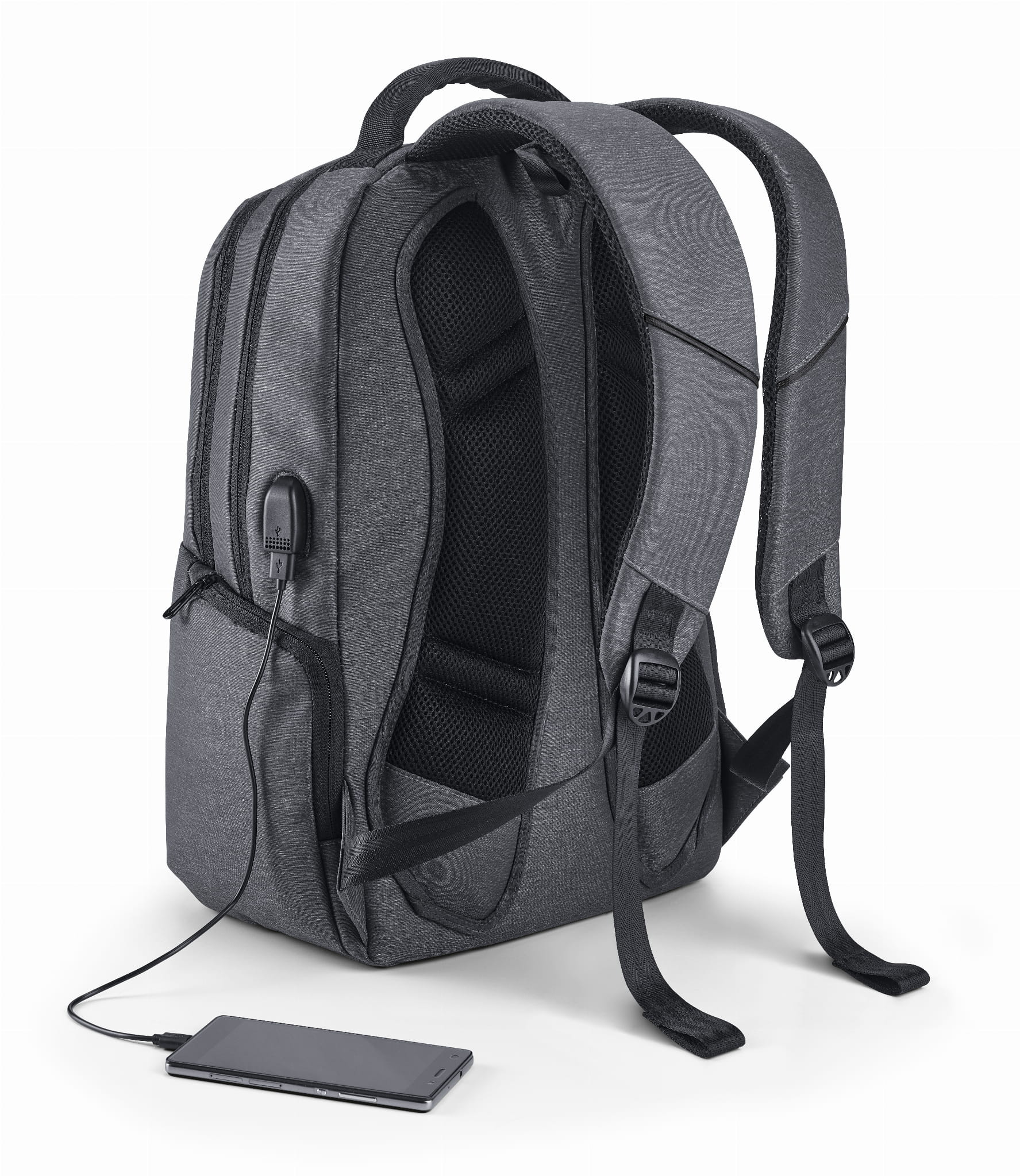Plecak na laptop. Nylon 2Tone wodoodporny. Z 2 przegrodami. Komora tylna z wewnętrzną kieszenią zapinaną na zamek i wyściełaną przegrodą na laptop do 17''. Komora przednia z wieloma kieszeniami wewnętrznymi, 2 przednie kieszenie i 2 boczne kieszenie, port USB i kabel USB/micro-USB do podłączenia urządzeń mobilnych (bateria przenośna nie jest dołączona). Miękki tył, z systemem podparcia pleców i szelki. Akcesoria nie są dołaczone.