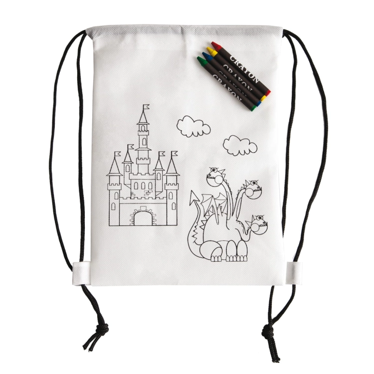 Plecak z materiału non woven w białym kolorze do samodzielnego kolorowania. Wyposażony w 4 kredki woskowe w kolorach: czerwony, niebieski, żółty i zielony.