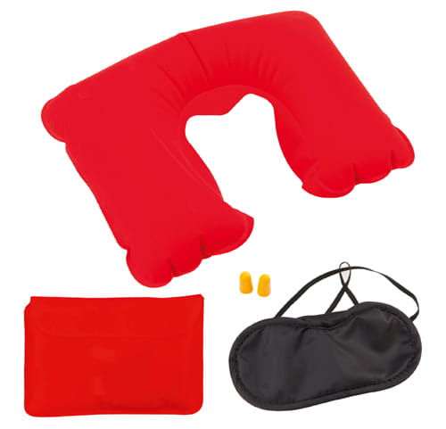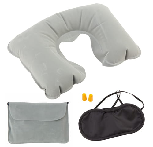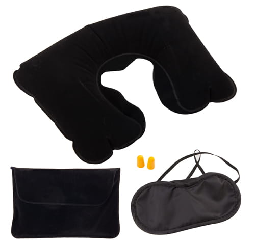 Zestaw podróżny z dmuchaną poduszką, opaską na oczy i zatyczkami do uszu. Dostarczany w dopasowanym kolorystycznie, aksamitnym opakowaniu.