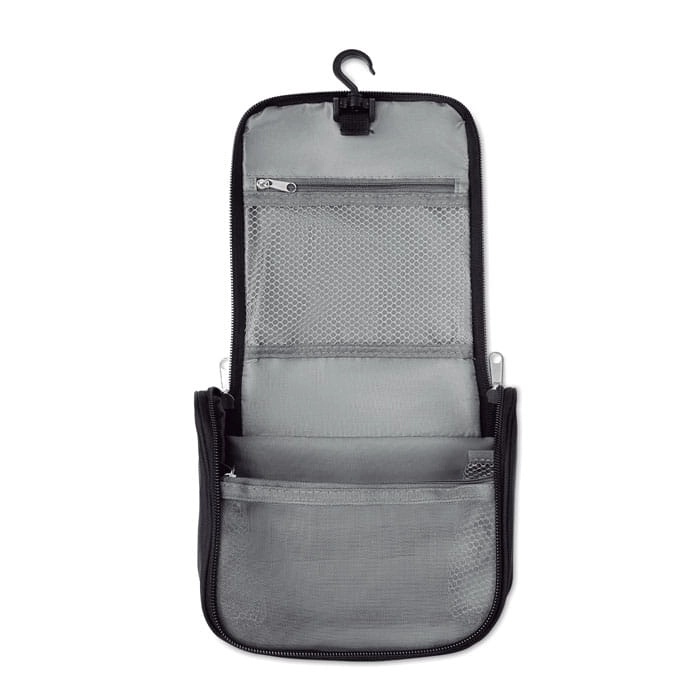 Wisząca kosmetyczka z wieloma przegrodami i siatkowymi kieszeniami. Mocny polyester. Doskonała na podróż.