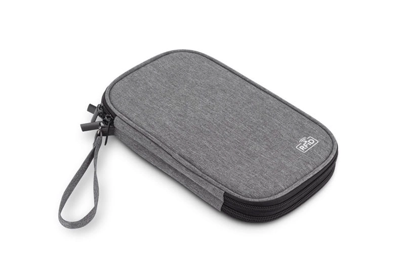 Portfel podróżny CHILLGO posiada wiele różnej wielkości przegródek. Zapięcie na zamek z uchwytem ułatwia trzymanie portfela. Wyposażony jest on w folię zabezpieczającą przed kradzieżą danych z kart kredytowych, blokując sygnał RFID. Wykonany z poliestru 300D.
