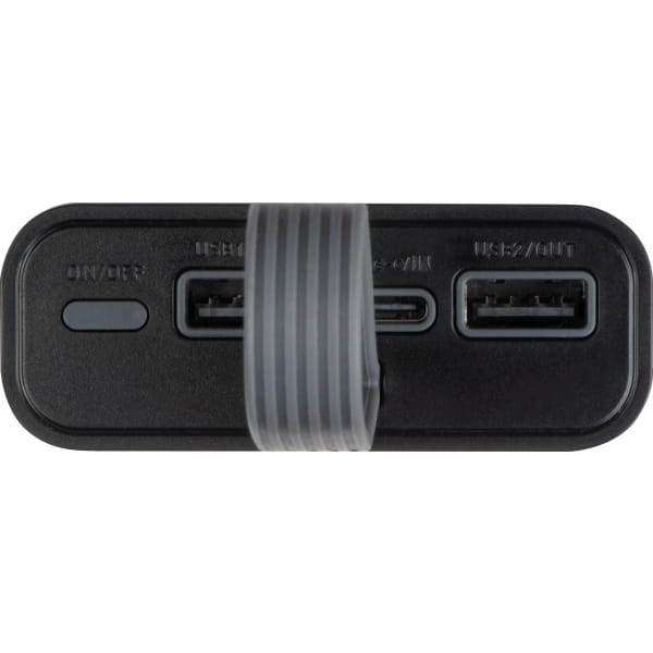 Power bank o pojemności 10 000 mAh, wyposażony w 3 porty ładowania (2 x USB, 1 x Type-C), wskaźnik naładowania i pasek do przenoszenia.
