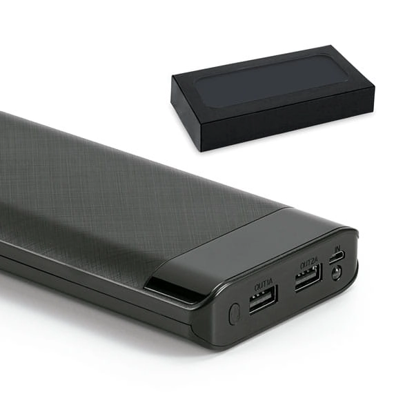 Przenośna bateria. ABS. Bateria litowa. Pojemność: 16.000 mAh. Czas życia ≥ 1.000 cykli. Z wejściem 5V/2.1A, wyjściem 5V/1-2.1A, wskaźnikiem ładowania, 2 portami USB i 1 portem micro USB. Z zabezpieczeniem przed przeciążeniem, zwarciem i przegrzaniem. Zawiera kabel USB/micro USB do ładowania baterii. Dostarczana w pudełku prezentowym.