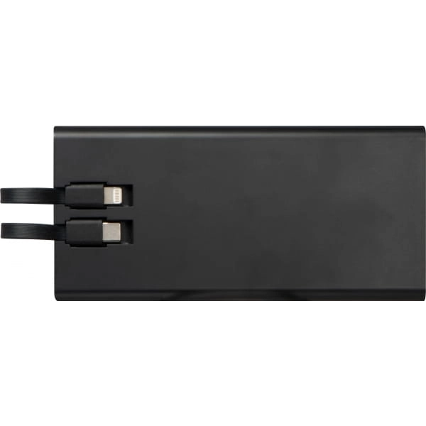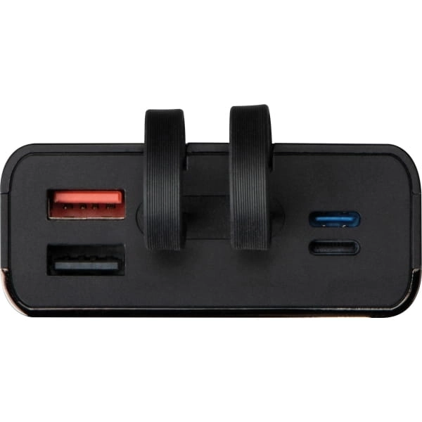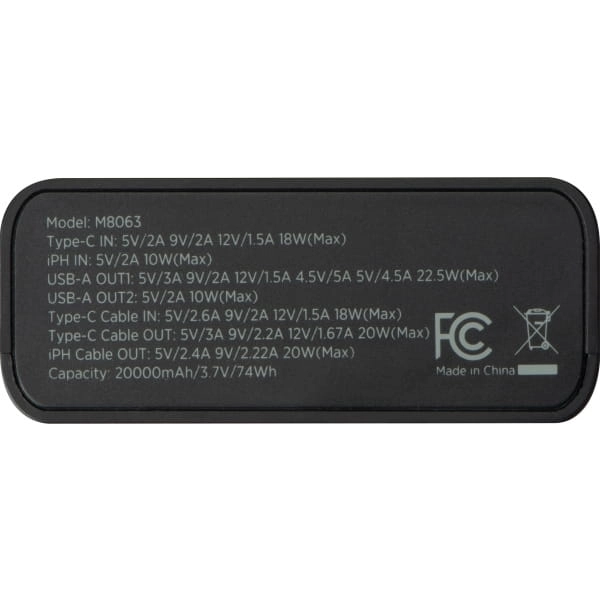 Power bank z funkcją szybkiego ładowania, o pojemności 20 000 mAh. Posiada 2xport USB i port typu C, wbudowany kabel typu C i lightning oraz cyfrowy wyświetlacz wskazujący aktualny stan naładowania oraz inne ważne informacje.