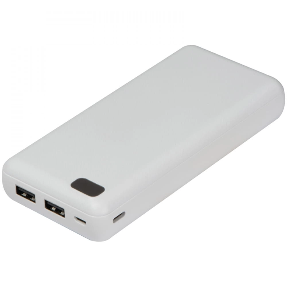 Plastikowy power bank o mocy 20 000 mAh z cyfrowym wskaźnikiem ładowania. Dwa porty USB umożliwiają jednoczesne ładowanie dwóch urządzeń. Kabelek dołączony.