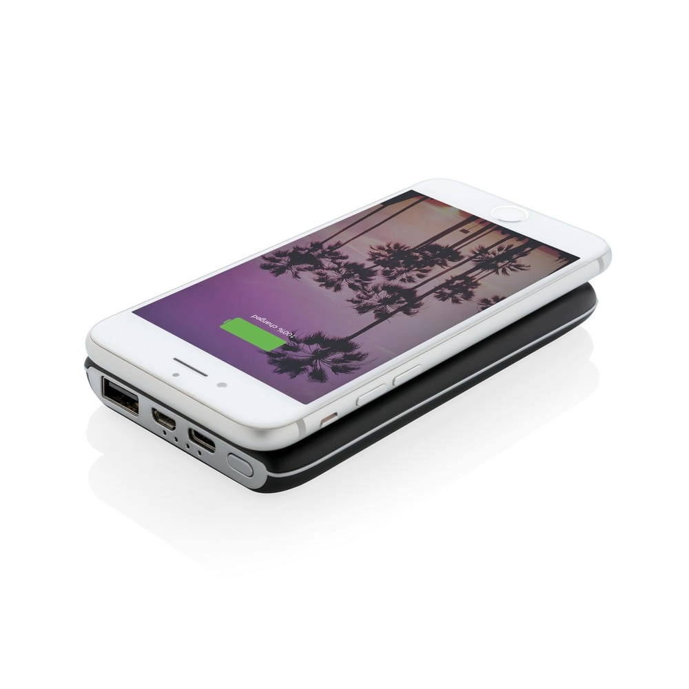 Płaski i wytrzymały power bank 4000 mAh z akumulatorem litowo-polimerowym. Power bank posiada mocne przyssawki, dzięki którym idealnie dopasuje się do ładowanego urządzenia. Ponadto, dzięki funkcji ładowania bezprzewodowego naładuje Twoje urządzenie bez użycia kabli. Urządzenie jest również wyposażone w standardowy port USB oraz port USB typu C do ładowania urządzeń mobilnych. Wyjście 5V/2A, wejście 5V/2A, wejście USB typu C 5V/2A, wyjście USB typu C 5V/2A, wyjście bezprzewodowe 5V/1A 5W. Bezprzewodowe ładowanie jest kompatybilne ze wszystkimi urządzeniami posiadającymi możliwość ładowania indukcyjnego. Kabel micro USB w komplecie. Wzór zastrzeżony®