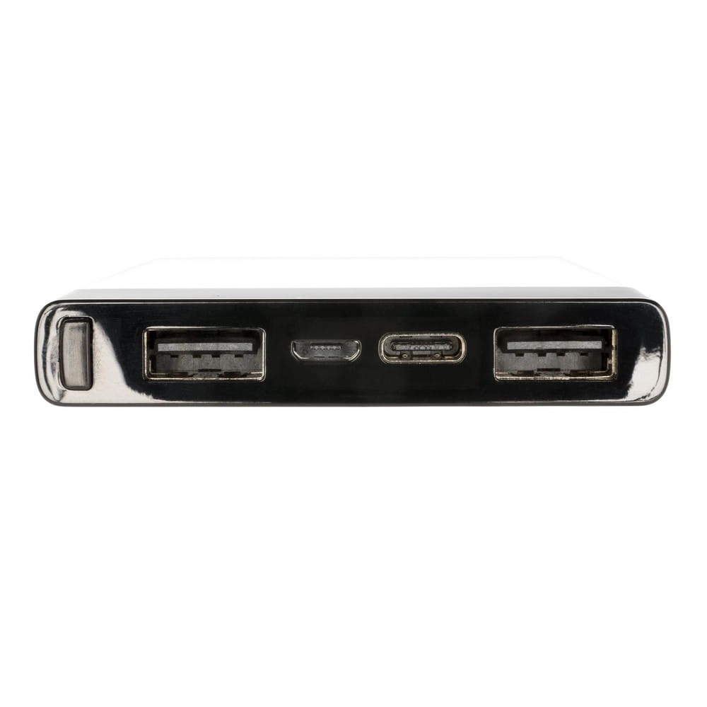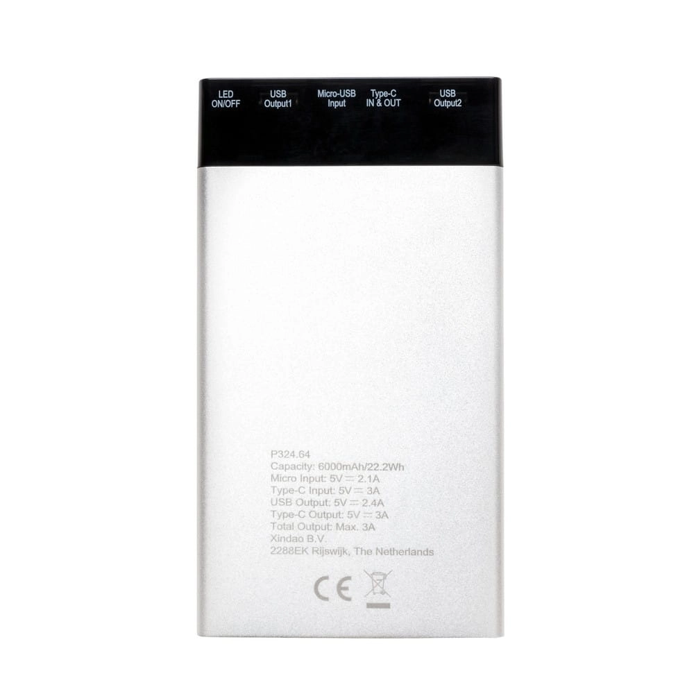 Power bank 6000 mAh z trwałą baterią litowo-polimerową. Ten aluminiowy power bank posiada wyświetlacz cyfrowy, który wskazuje poziom energii, dzięki czemu zawsze wiadomo, kiedy trzeba go naładować. Wyposażony w standardowe gniazdo USB oraz USB typu C. Posiada szybkie wejście i wyjście, dzięki czemu ładowanie odbywa się dwa razy szybciej niż w przypadku większości innych power banków. Wejście 5V/2.1A, gniazdo micro USB (do ładowania), wejście typu C 5V/3A, wyjście USB 5V/2.4A, wyjście typu C 5V/3A. Kabel micro USB w komplecie.