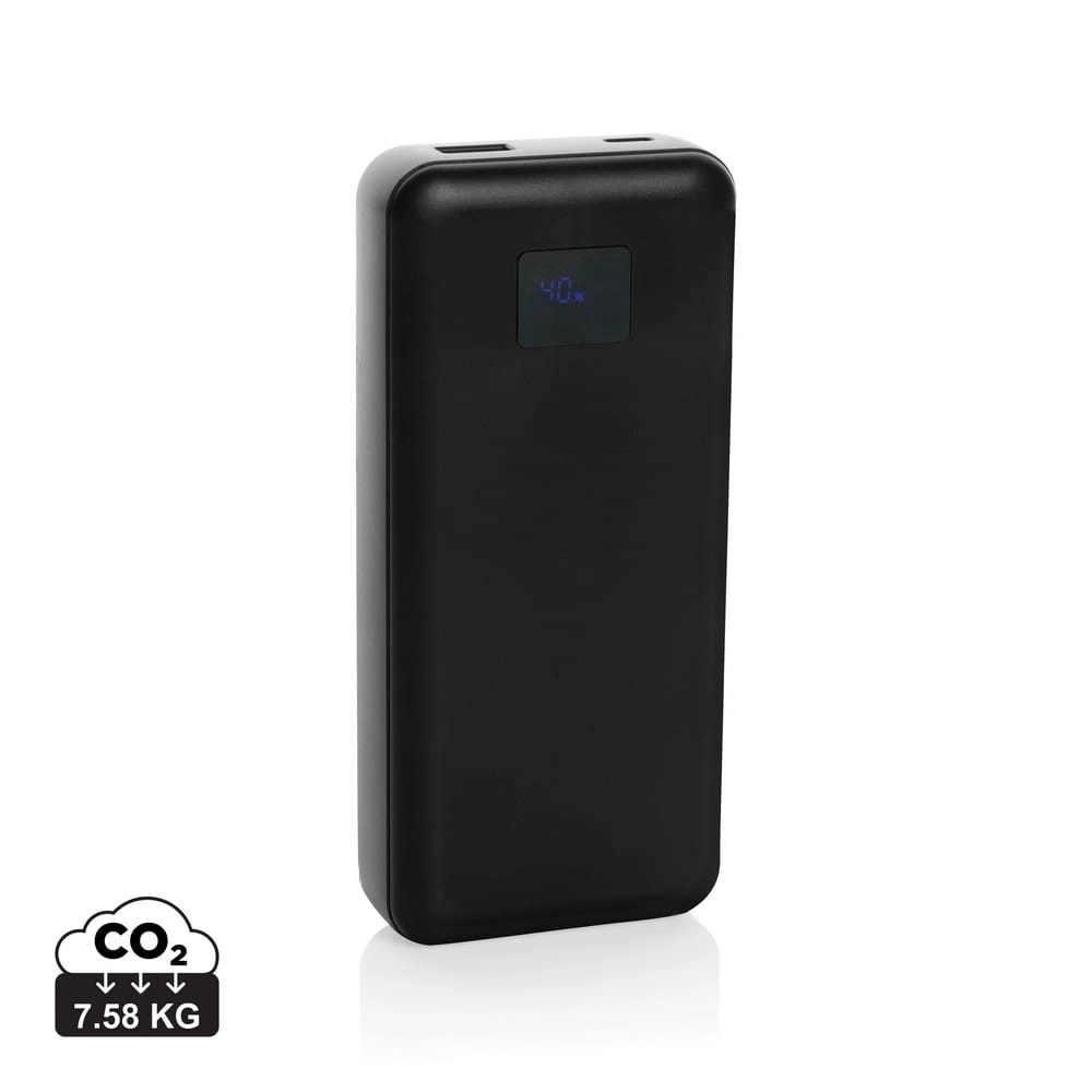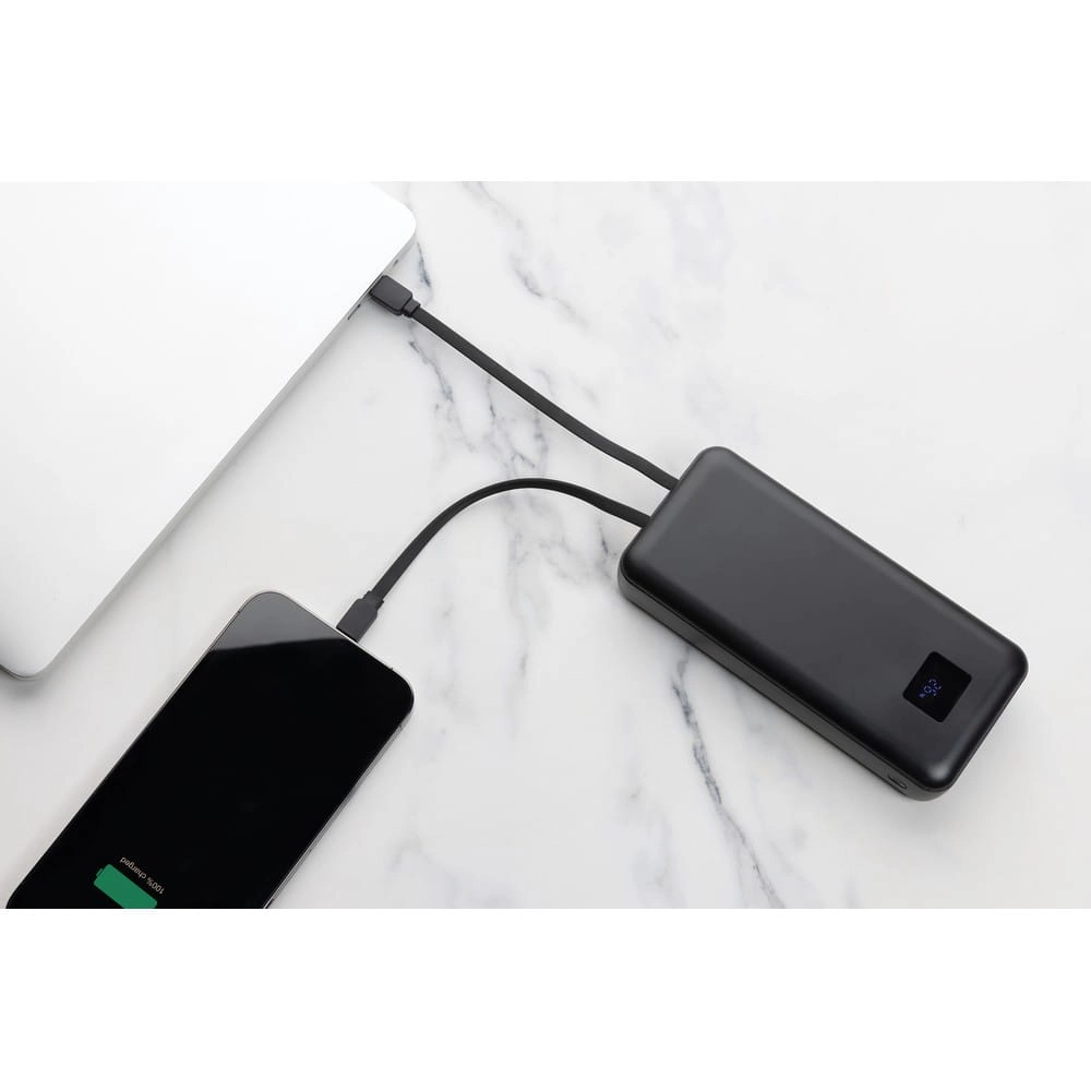 Power bank do laptopa 20000 mAh, moc ładowania przewodowego do 65W, która wystarczy do naładowania laptopa, zintegrowane kable USB C i iOS, wyświetlacz LED, wykonany z ABS z recyklingu z certyfikatem RCS, całkowita zawartość materiałów obliczona na podstawie wagi całkowitej przedmiotu: 23%