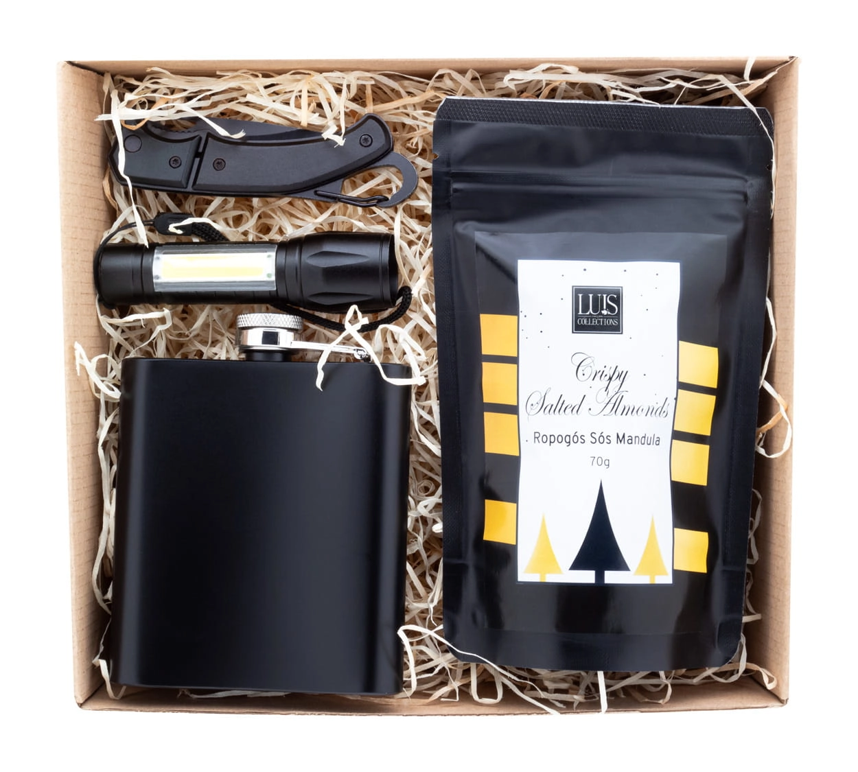 Zestaw prezentowy Spirit w tekturowym pudełku z wypełnieniem dekoracyjnym z wełny drzewnej i czerwoną wstążką. Zawiera: piersiówkę „Gravning”; scyzoryk „Angus”; latarkę akumulatorową „Chargelight Zoom”; chrupiące solone migdały „Luis”.