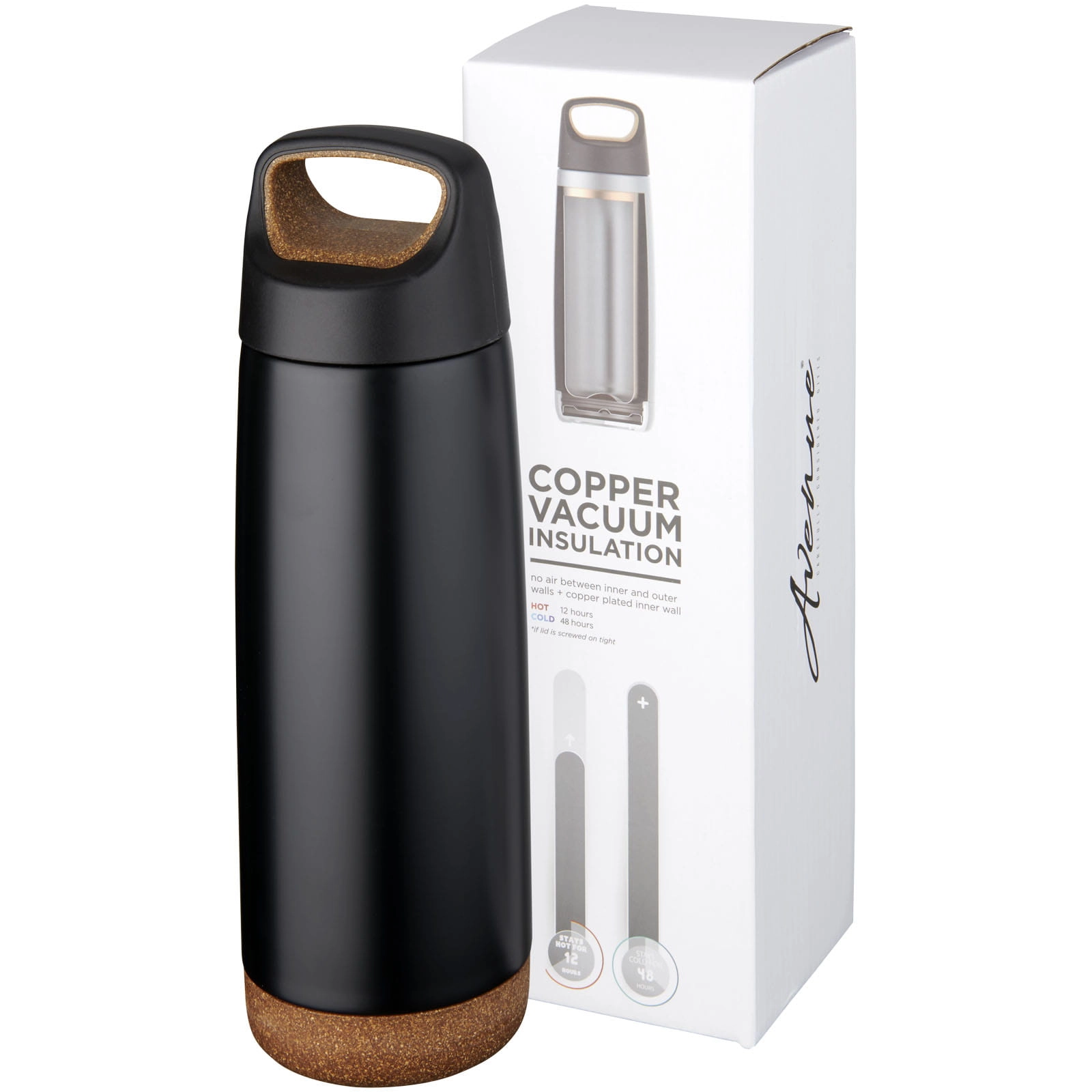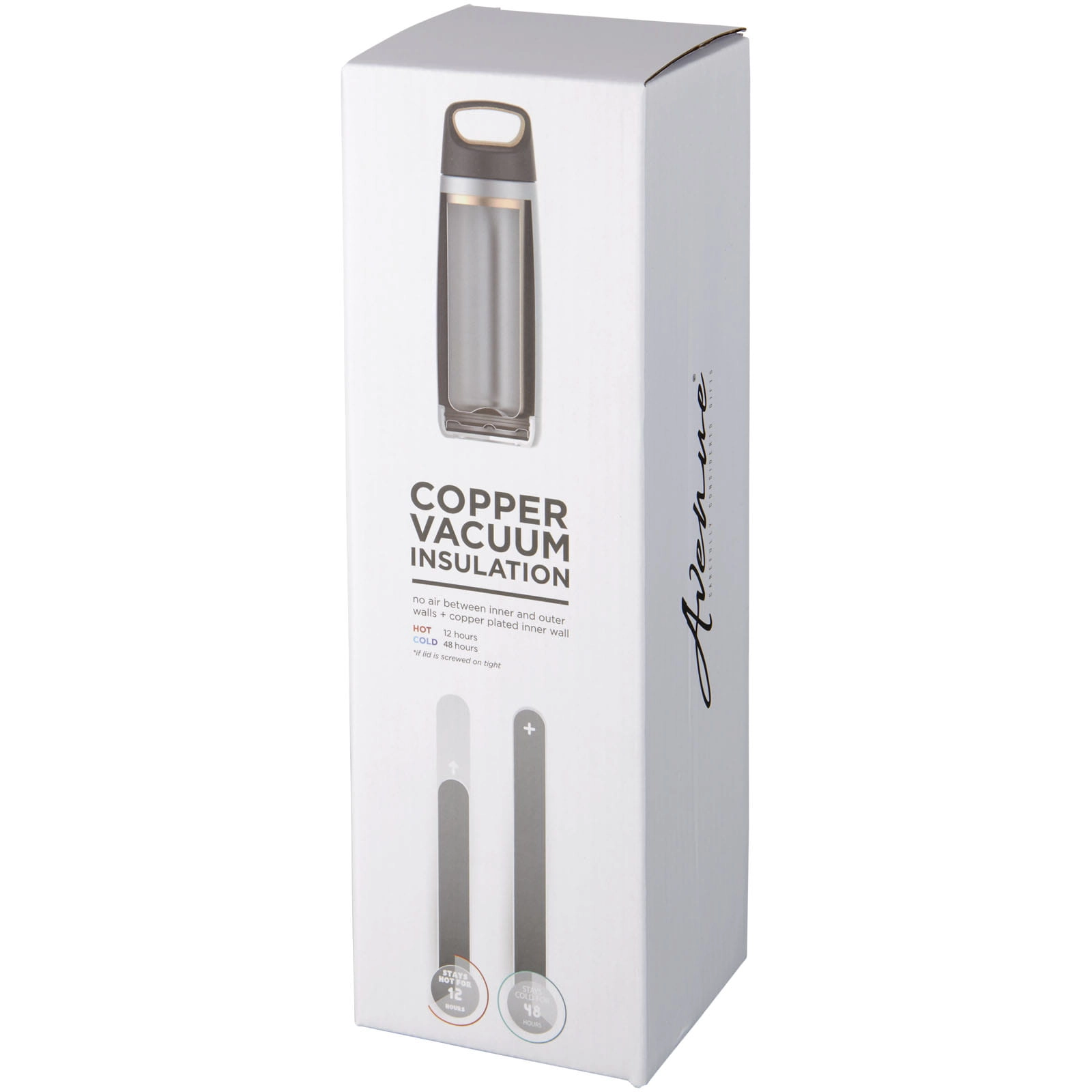 Próżniowo izolowany miedziany bidon Valhalla o pojemności 600ml. Dwuwarstwowa próżniowa konstrukcja ze stali nierdzewnej i miedziana izolacja zapewniają utrzymanie niskiej temperatury napojów przez 48 godzin i wysokiej przez co najmniej 12 godzin. Konstrukcja zapobiega również kondensacji na zewnątrz butelki. Zakręcana pokrywa z elementami korka oraz antypoślizgowe dno. Pojemność 600ml. Zapakowany w pudełko upominkowe Avenue. Stal nierdzewna z korkiem.