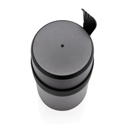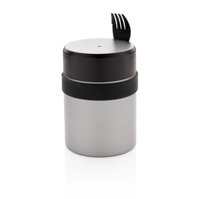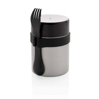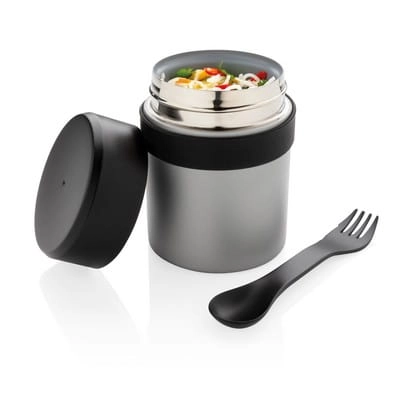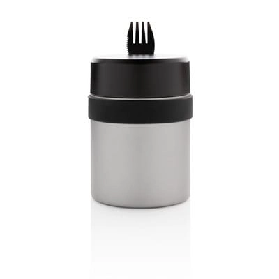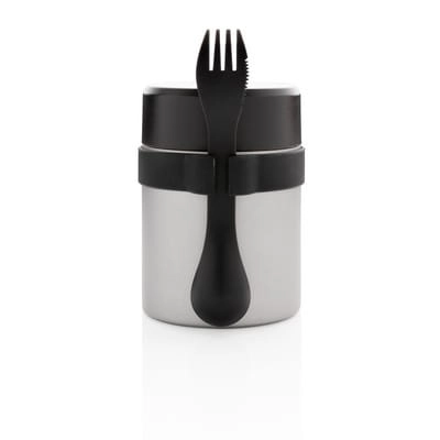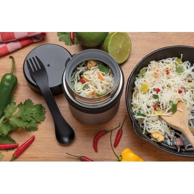 Próżniowy pojemnik na żywność 400 ml z powłoką ceramiczną na ścianie wewnętrznej eliminującą metaliczny posmak żywności, podwójne ścianki ze stali nierdzewnej z próżnią między ściankami, szczelne wieczko, utrzymuje temperaturę ciepłej żywności do 5 godzin oraz zimnej do 15 godzin, w zestawie sztućce 3 w 1 (widelec, nóż i łyżka), wzór zastrzeżony®