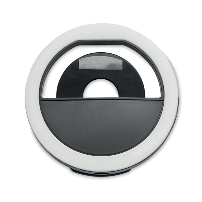 8 cm przenośny pierścień do selfie z tworzywa ABS z 28 diodami LED. Białe światło regulowane na 3 różnych poziomach jasności. Ładowalna bateria USB 80 mAh. Przenośna lampa pierścieniowa do selfie.