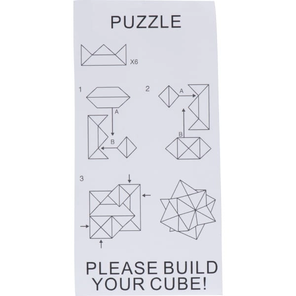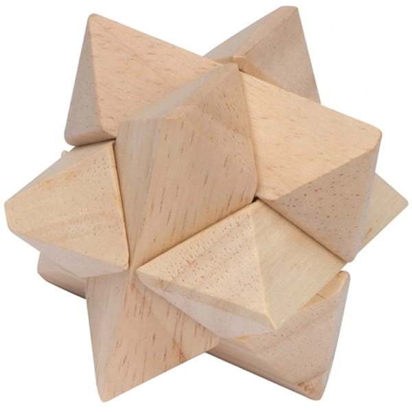 Drewniane puzzle 3D w kształcie gwiazdy. Całość zapakowana w woreczek.