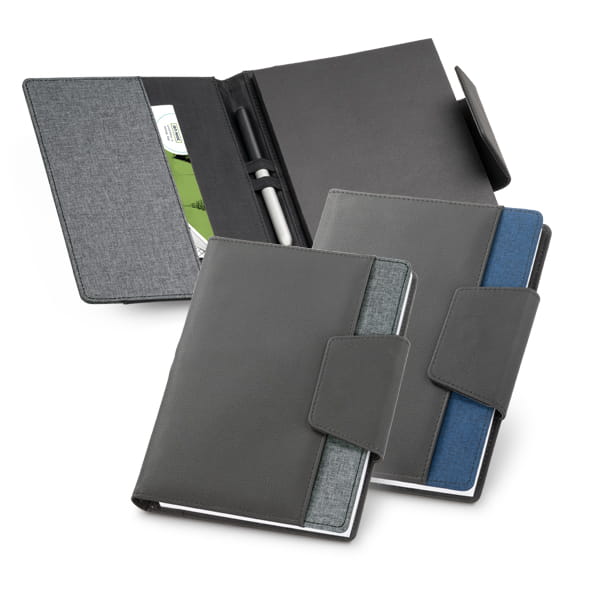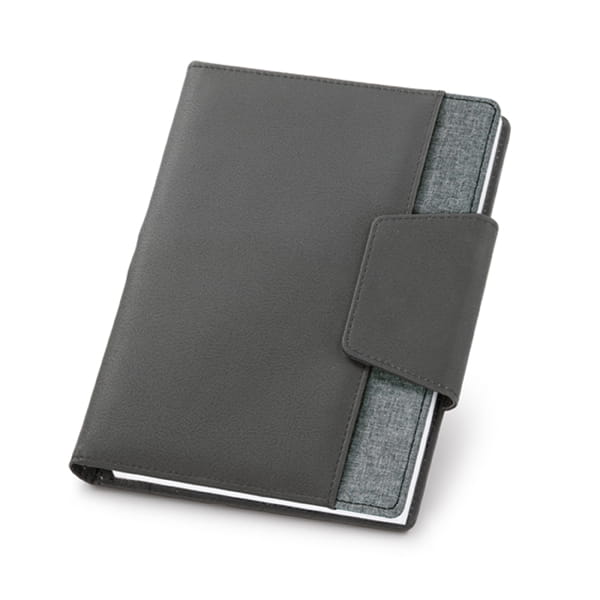 Teczka z notesem. Imitacja skóry i tkanina poliestrowa. Teczka z magnetycznym zamkiem i zewnętrzną kieszenią. Wyjmowany notatnik: 80 czystych kartek. Z wewnętrzną kieszenią i uchwytem na długopis. Dostarczany w etui z materiału non-woven. Długopis nie jest wliczony w cenę.