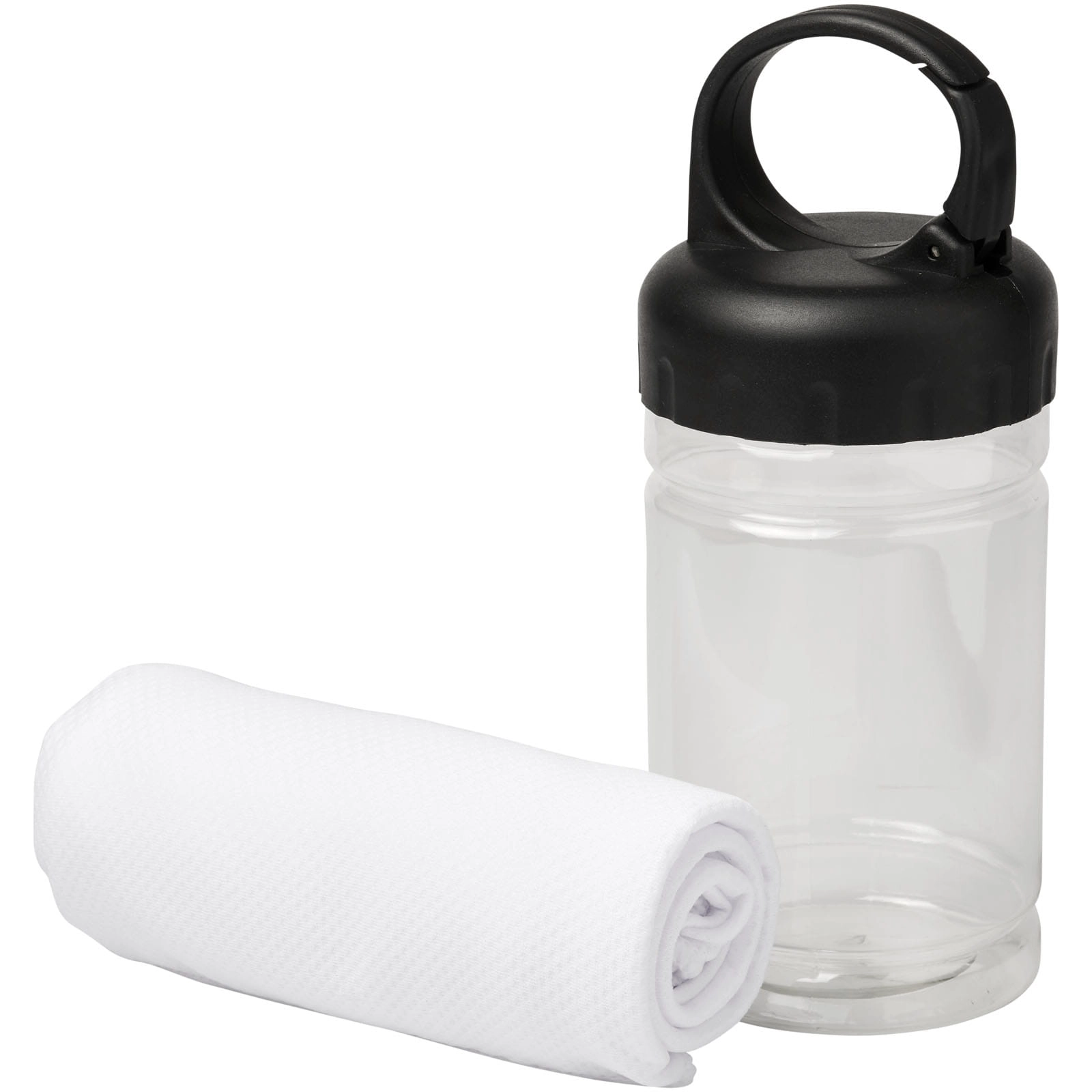 Ręcznik chłodzący Remy w pojemniku. Ręcznik chłodzący Remy w pojemniku. Szybko wchłaniający, szybkoschnący i nadający się do prania ręcznik chłodzący do schładzania się podczas ćwiczeń lub aktywności na świeżym powietrzu. Dostarczany w pojemniku z uchwytem do przenoszenia z wbudowanym karabińczykiem ułatwiającym przenoszenie. Dostępny w 5 żywych kolorach. Duża przestrzeń na logo na pojemniku, dekoracja możliwa również na samym ręczniku chłodzącym. Wymiary: 30 x 80 cm. PET. 0,096. PET. 0,096.