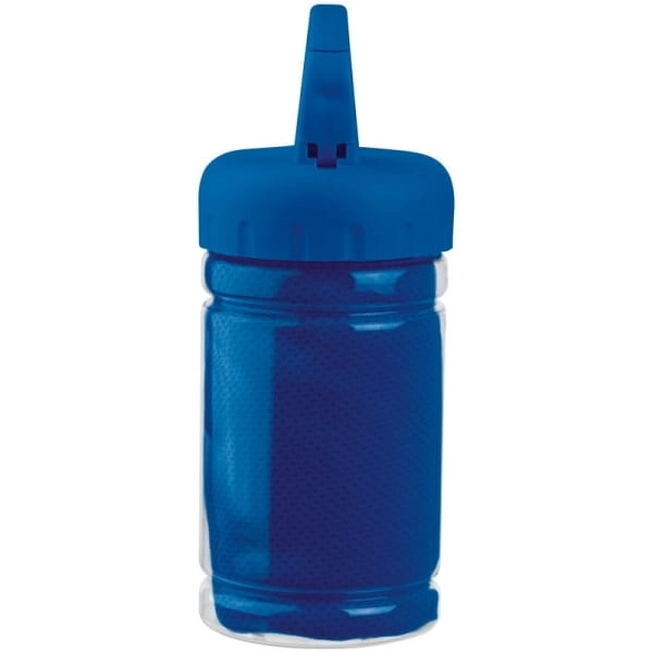 Ręcznik sportowy (79 x 29 cm) z szybkoschnącego materiału, umieszczony w plastikowej butelce. Zakrętka butelki ma otwierany uchwyt umożliwiający przypięcie butelki np. do paska od spodni.
