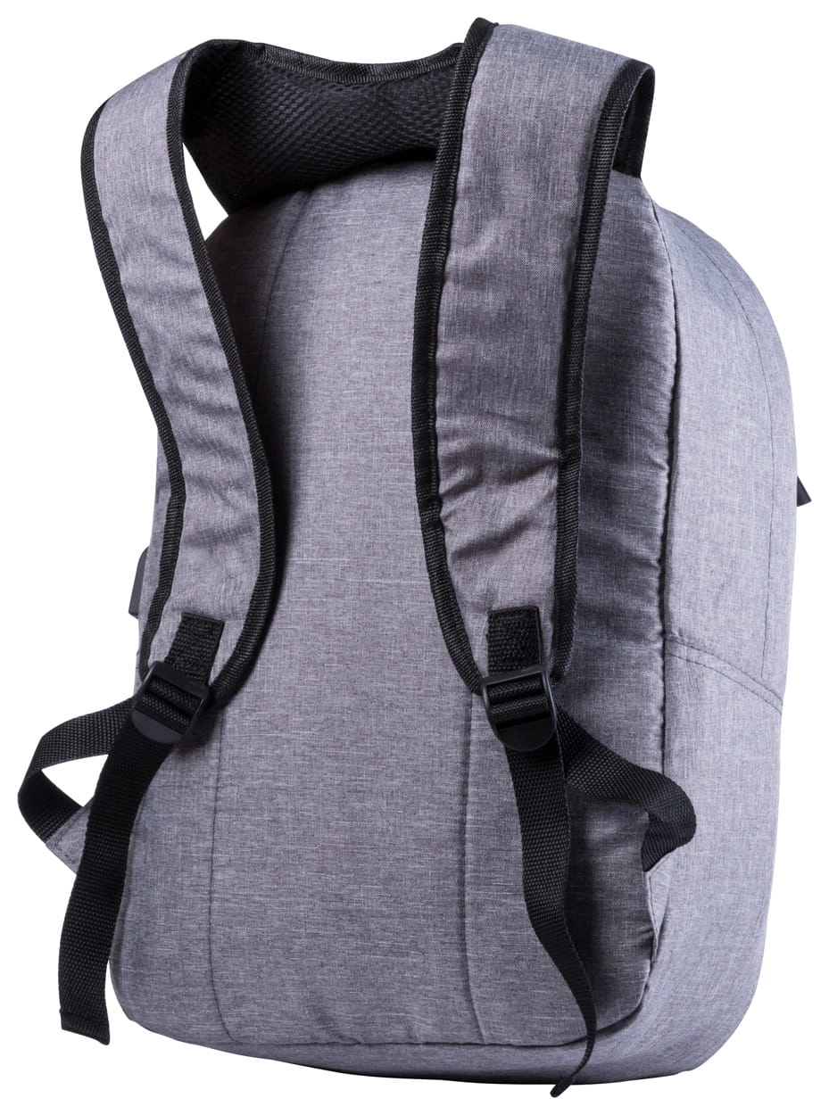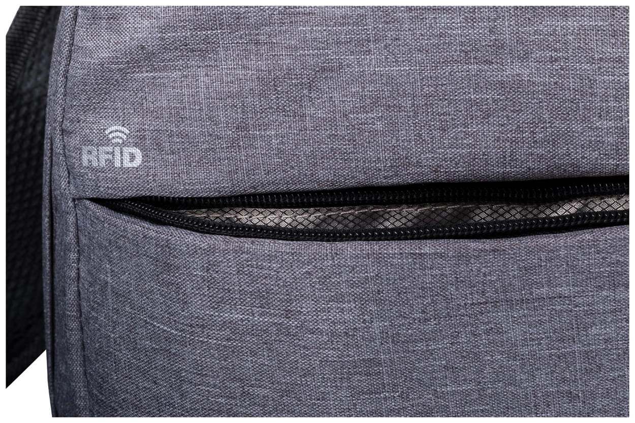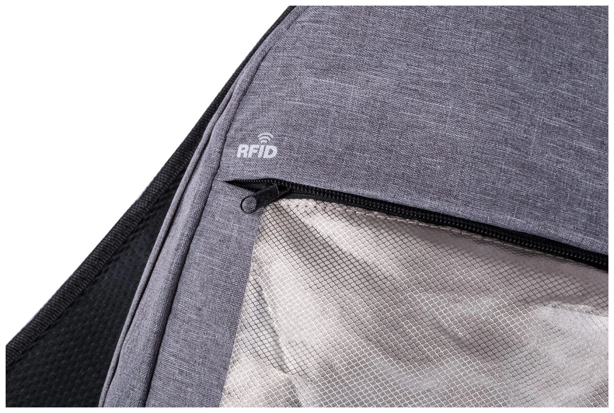 Plecak z ochroną RFID i wieloma przegródkami na zamek błyskawiczny, wyściełaną przegrodą na laptopa (15"), wyściełanymi plecami i paskami na ramiona, Z wbudowanym złączem USB dla powerbanków, poliester 300D.