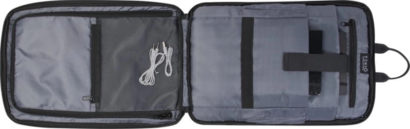 Plecak Rise wykonany z trwałego poliestru 900D z recyklingu z certyfikatem GRS spełnia wszystkie niezbędne funkcje. Posiada wyściełane etui na laptopa o przekątnej 15,6 cali, dodatkową kieszeń na mały notebook lub tablet oraz zapinane na zamek kieszenie na mniejsze przedmioty. Dodatkowo po wewnętrznej stronie znajduje się elastyczny pasek do mocowania butelek z wodą. Z tyłu plecaka znajduje się wygodny, elastyczny pasek, który ułatwia przymocowanie go do wózka.