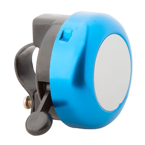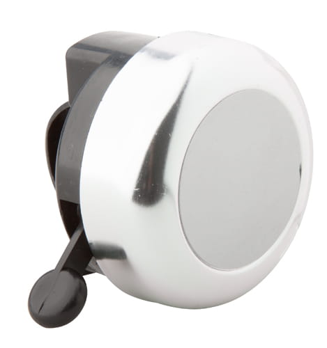 Aluminiowy dzwonek do roweru ze srebrną tabliczką.