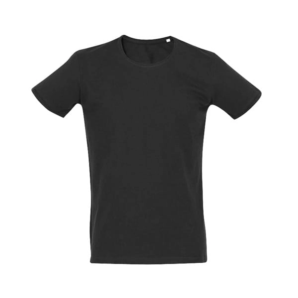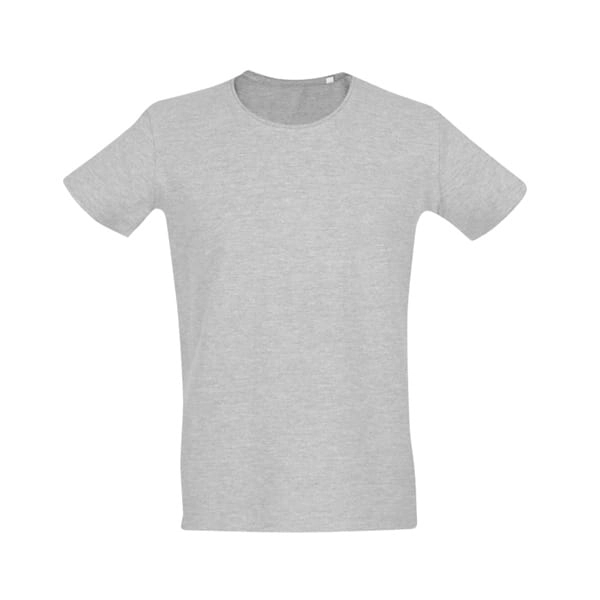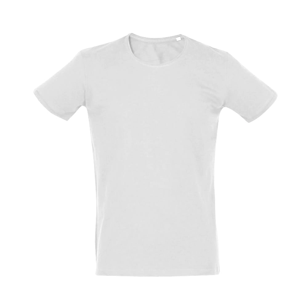 Męski t-shirt. Piqué 100% bawełna: 195 g/m?. Kolor 83: 85% bawełna/15% wiskoza. 1x1 wąski kołnierzyk. Brak metki wewnętrznej na kołnierzyku. Cięta i szyta. Ściągacze na rękawach.
