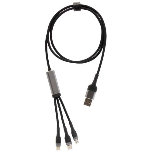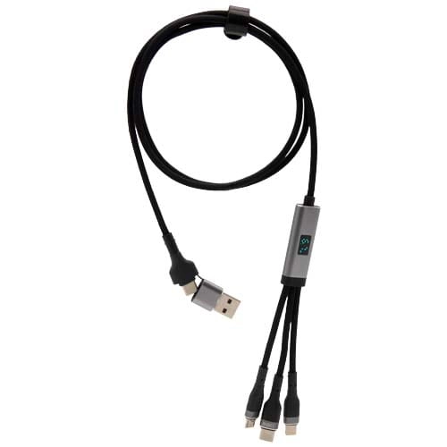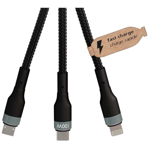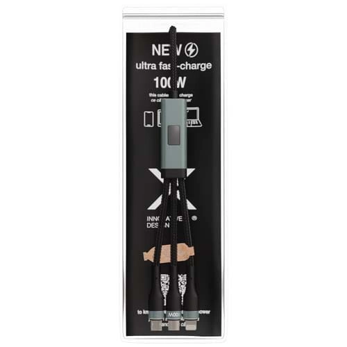 Kabel do ultraszybkiego ładowania 5 w 1 o mocy 100 W z tworzywa sztucznego rPET, który umożliwia ładowanie smartfonów, tabletów i laptopów. Podwójne wejście USB-A + USB-C sprawia, że kabel jest w 100% kompatybilny z najnowszymi modelami komputerów. Moc: Typ C, Micro USB i Lightning. Dostarczany z nadającym się do recyklingu etui z TPU i wkładką z papieru z recyklingu. Długość kabla: 1 metr.