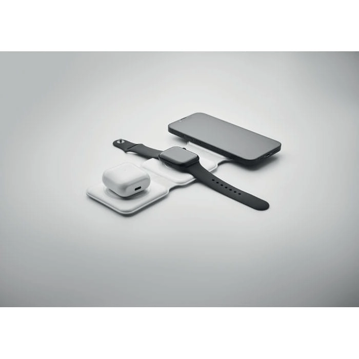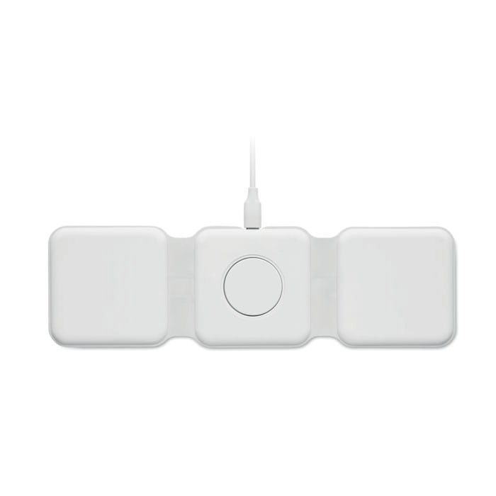 Składana stacja ładująca 3 w 1 z ABS. Posiada 3 punkty ładowania bezprzewodowego (15W). Wejście: 2 w 1 Type-C i Type-A. Kompatybilny ze wszystkimi urządzeniami obsługującymi QI, takimi jak najnowszy Android, iPhone® 8, X i nowsze. Kompatybilny również z iWatch.