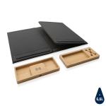 Składany organizer na biurko, podstawka na laptopa do 17”, bambusowa ładowarka bezprzewodowa 10W, bambusowy stojak na długopisy, ładowarka i stojak przymocowane na magnes, organizer wykonany z materiałów pochodzących z recyklingu do produkcji których zostało ponownie wykorzystanych 11 butelek PET o pojemności 0,5 l oraz zaoszczędzone zostało 6,6 l wody, dzięki zastosowaniu technologii śledzącej AWARE™ wykorzystane włókna są identyfikowalne z pochodzenia, 2% wpływów z każdego sprzedanego produktu jest przekazywane na rzecz Water.org, kabel micro USB w komplecie, nie zawiera PVC