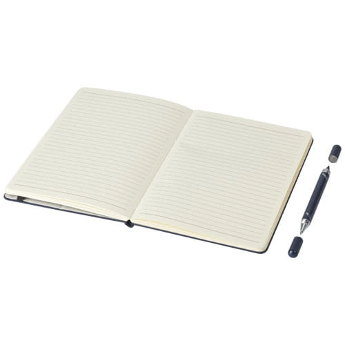 Skribo zestaw z notatnikiem i długopisem jest częściowo wykonany z poużytkowego poliestru pochodzącego z recyklingu, co czyni go bardziej zrównoważonym wyborem, ponieważ pomaga zmniejszyć zużycie pierwotnego surowca. Zawiera długopis z czarnym tuszem i 80 kremowych kartek w linie z papieru z recyklingu o gramaturze 80 g/m2, pochodzącego ze zrównoważonych źródeł. Długość linii pisania długopisu wynosi 1000 metrów.